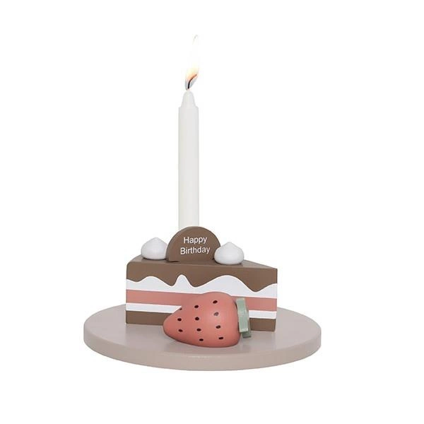 Drewniany świecznik urodzinowy z motywem kawałka tortu - to idealna dekoracja urodzinowa, na przyjęcia dla każdej damy i młodego dżentelmena.