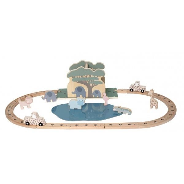 Drewniany tor ze zwierzakami safari to nowość skandynawskiej marki Jabadabado. Z naszym nowym pociągiem safari z łatwością przeniesiesz się do dzikiej Afryki, gdzie czeka wiele niezwykłych przygód! Ahoj przygodo! Znasz już wszystkie dzikie zwierzęta? Z pewnością potrafisz je już rozpoznać, ten tor pozwoli Ci się z nimi zaprzyjaźnić na dobre! Po skończonej zabawie zmęczone zwierzaki, mogą sobie bezpiecznie odpocząć i schować w cieniu małego domku. Jest w nim mała drabinka, by mogły się wdrapać na dach domku skąd mają zapewne piękny widok, i mogą się bezkarnie lenić i opalać:)