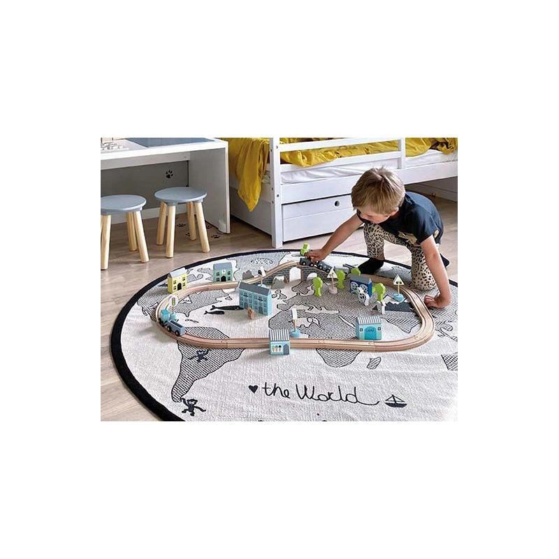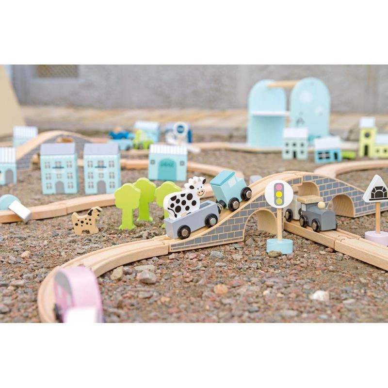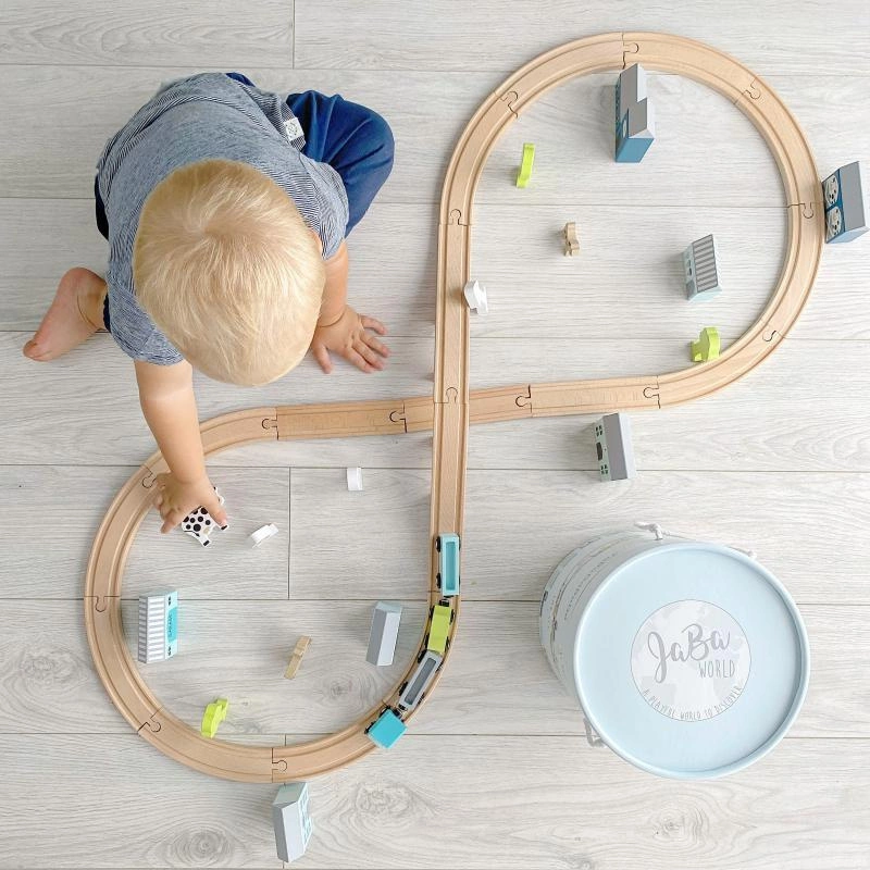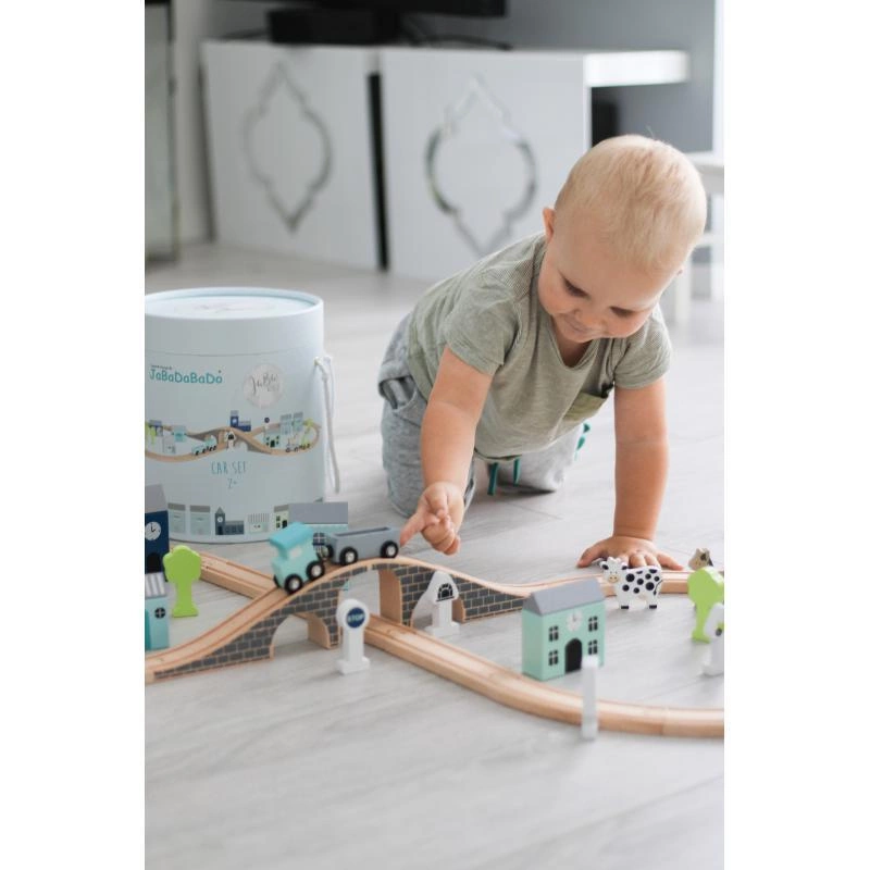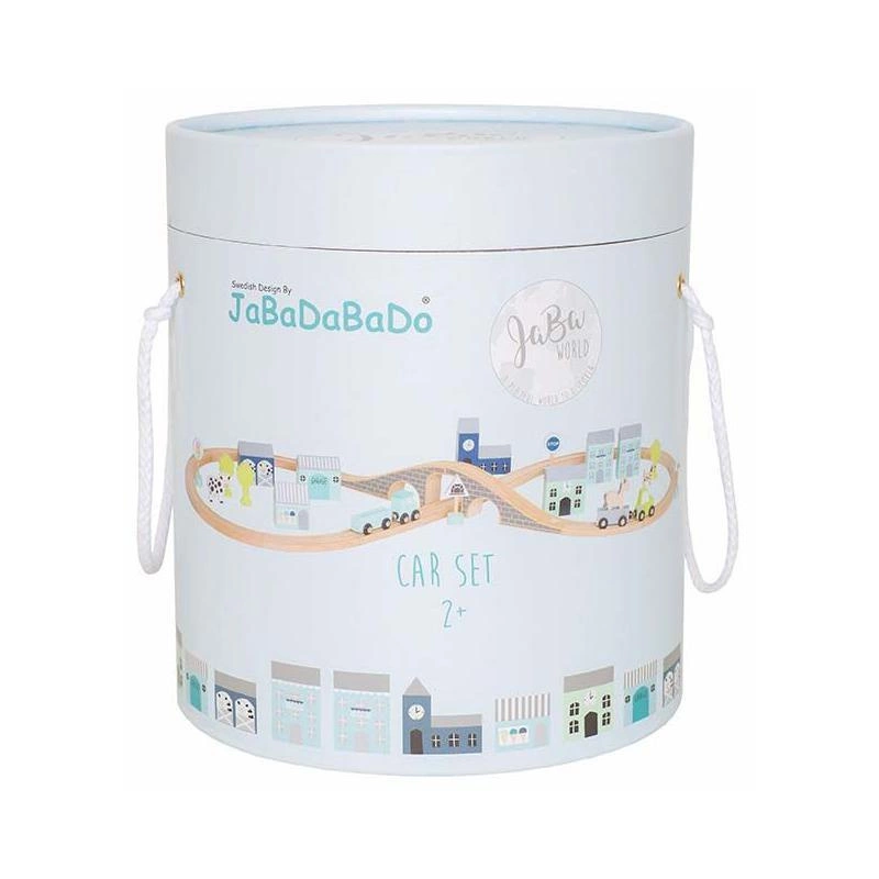 Ten zestaw jest kombatybilny z pozostałymi zabawkami szwedzkiej marki Jabadabado takimi jak: kolejka drewniana, tor samochodowy w różowej kolorystyce, tor wyścigowy, stację pojazdów - co pozwoli Twojemu dziecku stworzyć swój włąsny, kolorowy świat Jabadabado. Produkt zapakowany w śliczne wiaderko z wygodnymi do przenoszenia uchwytami.