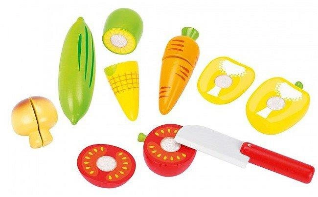 Drewniany zestaw do krojenia z warzywami Goki składa się z 12 drewnianych elementów, w skład których wchodzą warzywa łączone na rzep oraz drewniany nóż. Zestaw zawiera: pieczarkę, ogórka, marchewkę, kukurydzę, żółtą paprykę, pomidora. Z drewnianymi warzywami marki Goki dziecko ćwiczy zdolności manualne oraz rozwija umiejętności społeczne zachęcające do naśladowania dorosłych.