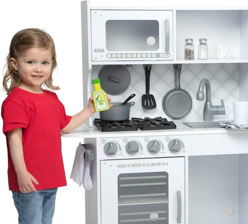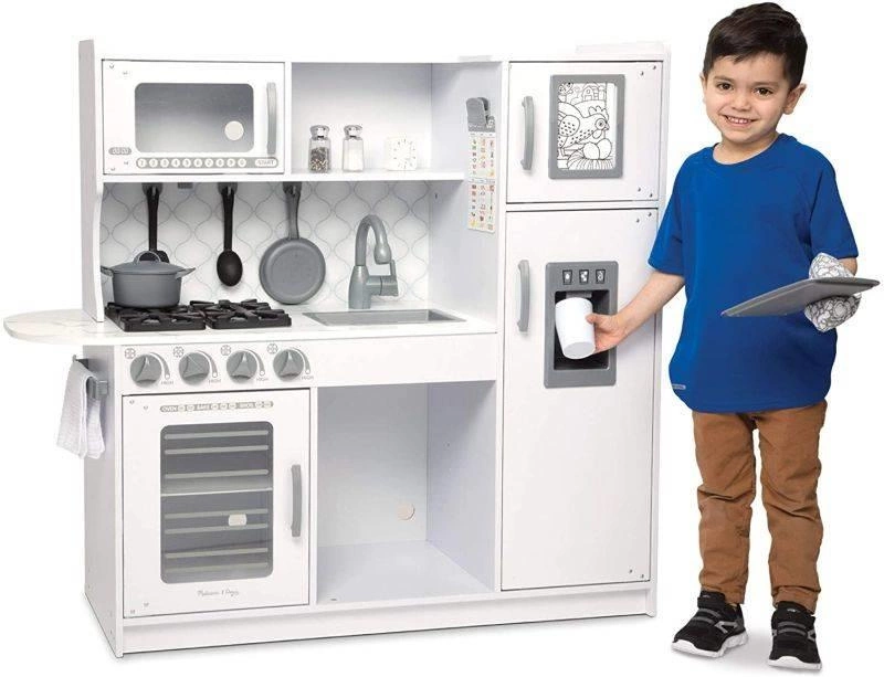 Nowoczesna, drewniana kuchnia Melissa & Doug to wspaniały pomysł na prezent dla wszystkich małych miłośników gotowania. Wyposażona w piekarnik, kuchenkę gazową, mikrofalówkę, zlew, lodówkę z działającym dozownikiem lodu, zamrażarkę oraz obszerny schowek sprawi, że przygotowywanie posiłków stanie się znakomitą zabawą i pasją. Wykonana z materiałów wysokiej jakości, solidna i trwała, a przy tym dużych rozmiarów umożliwia zabawę wielu dzieciom jednocześnie. Zaskakująca kostkarka do lodu potrafi dozować dwie dołączone „kostki lodu”, pokrętła obracają się, ruchomy talerz w kuchence mikrofalowej odgrzeje nasze posiłki, lista artykułów spożywczych zadba o nasze składniki, a drzwi otwierają się i zamykają. Kuchnia Melissa and Doug to wspaniały zestaw do zabawy z akcesoriami kuchennymi, udawanymi kolekcjami jedzenia i zabawy w gotowanie.