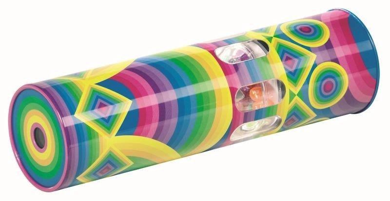 Kalejdoskop z kolorowymi wzorami z pewnością zainteresuje dzieci. Dodatkowo posiada pozytywkę - po nakręceniu gra muzyka oraz wewnątrz obracają się różne elementy i obraz w kalejdoskopie nieustannie się zmiania.