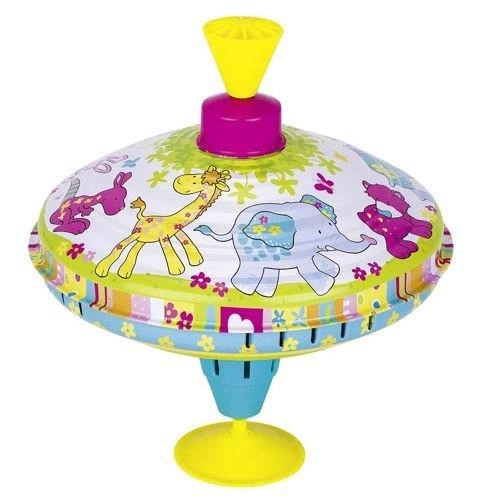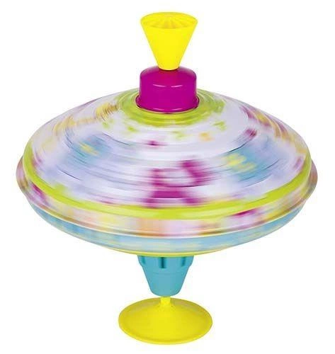 Duży metalowy bączek do kręcenia to tradycyjna zabawka, którą małe dzieci uwielbiają. W odróżnieniu od tradycyjnych bąków ten bączek ma na spodzie podstawkę. Dzięki temu stoi na niej stabilnie i się nie przewraca. Wystarczy zacząć naciskać górny drążek, aby całość zaczęła wirować i wydawać specyficzny dźwięk.