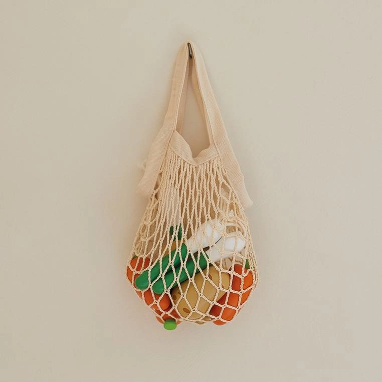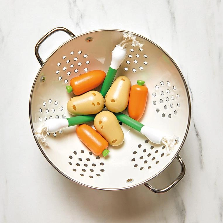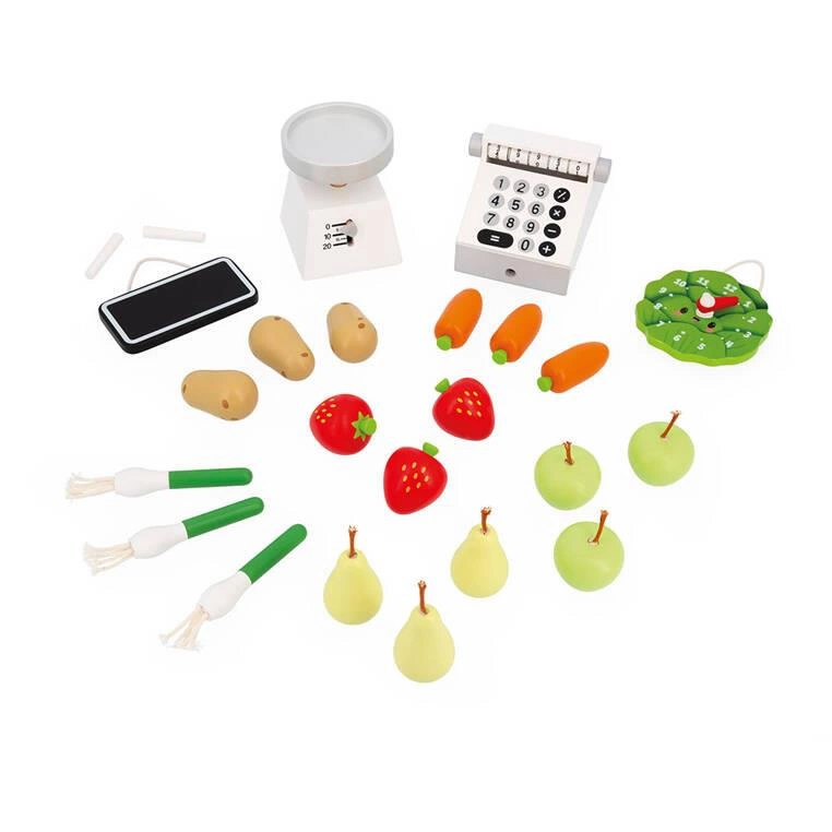 - 18 sztuk drewnianych warzyw i owoców (3 marchewki, 3 ziemniaki, 3 pory, 3 jabłka, 3 gruszki i 3 truskawki),