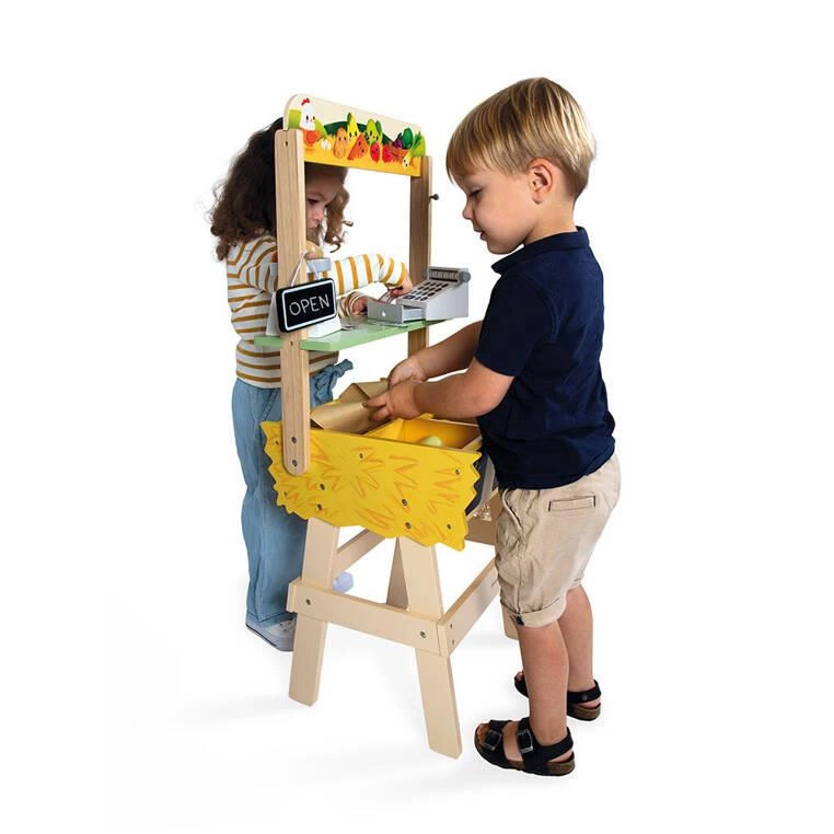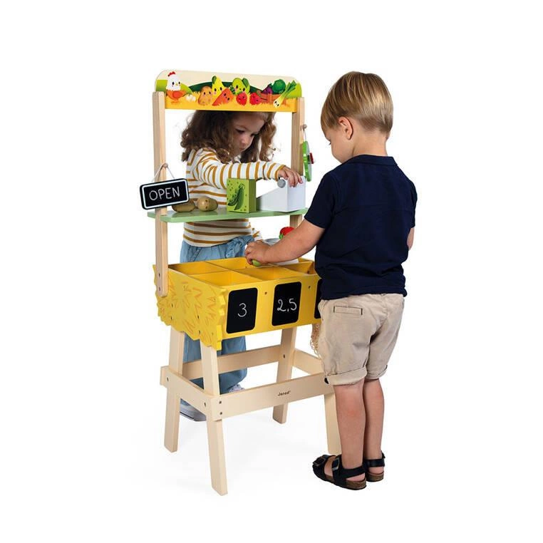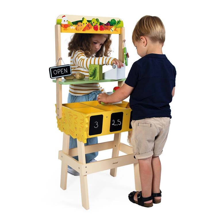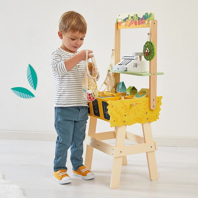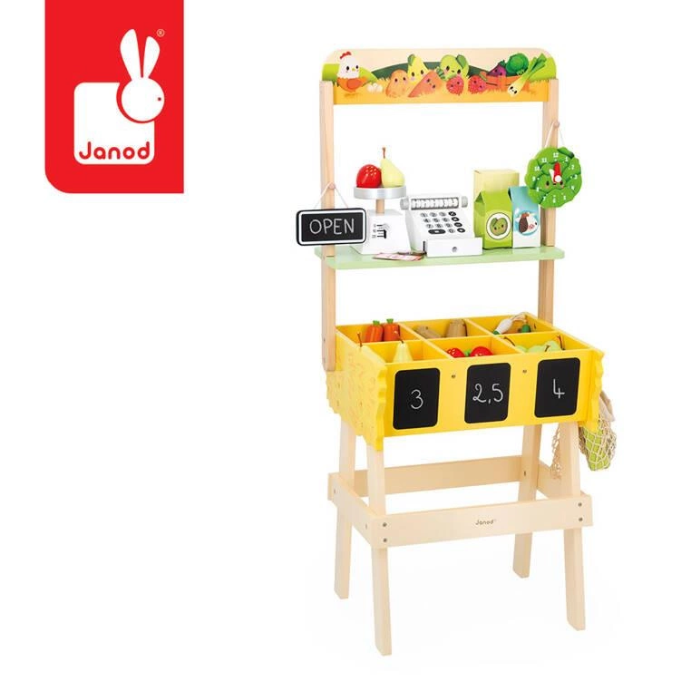 Sporych rozmiarów, drewniany, w pełni wyposażony sklep-warzywniak z kolekcji Farma francuskiej marki JANOD to idealny prezent dla każdego dziecka, które lubi bawić się w zakupy i naśladowanie dorosłych. Zabawka wspomaga rozwój na wielu płaszczyznach: ćwiczy zdolności manualne, uczy cierpliwości oraz koncentracji, wspiera wyobraźnię i umiejętności społeczne. Ponadto dzięki miejscom na segregowane produktów maluch przyswaja sobie również umiejętność porządkowania rzeczy.