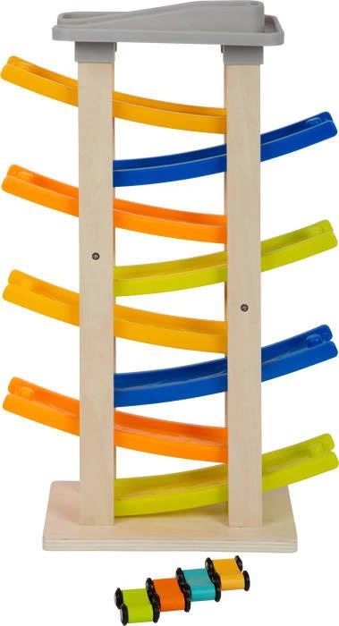 Duży tor dla samochodów wyścigowych Small Foot sprawi wiele frajdy najmłodszym miłośnikom szybkich aut. Solidna, drewniana podstawa utrzymuje kolorowe rampy, a na samym szczycie znajduje się parking dla czterech samochodzików. Pojazdy zjeżdżają po wyznaczonych torach, przy zmianie rampy wykonują salto i poruszają się dalej w dół. Który samochodzik zjedzie szybciej? Kolorowa drewniana zjeżdżalnia dla autek przyciągnie wzrok malucha i będzie wspaniałym pomysłem na prezent dla dziewczynki oraz chłopca. Zabawa torem wyścigowym XL Small Foot trenuje motorykę małą i koordynację wzrokowo-ruchową.