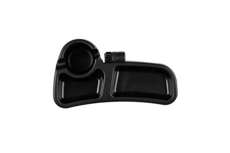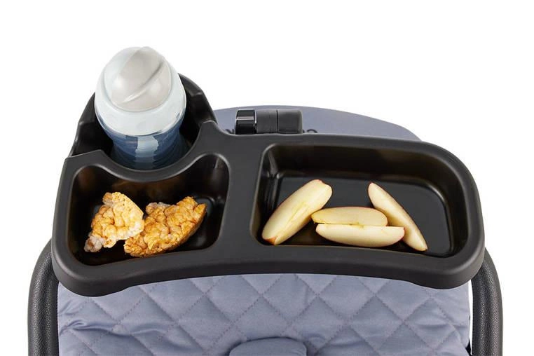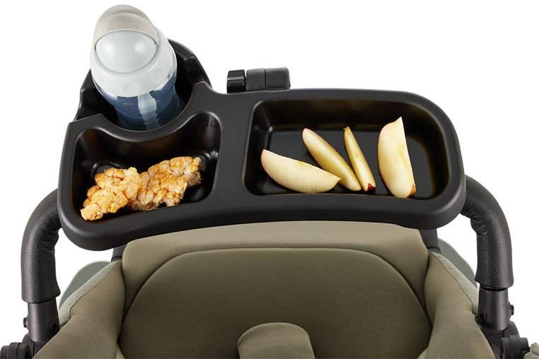 Tacka na przekąski, dedykowana do wózków Miley, Buggy Go, Jackey i Harvey 3 holenderskiej marki Easywalker. Solidnie mocowana do pałąka wózka na zintegrowany klips. Ma miejsce na kubeczek lub butelkę z napojem oraz dwie przestrzenie – mniejszą i większą – na przekąski, obie z wyższym brzegiem, który ułatwia dziecku samodzielne nabieranie smakołyków i zapobiega ich wypadaniu. Położenie tacki można regulować pokrętłem. To praktyczne i wygodne rozwiązanie, dzięki któremu maluch może spożyć pełen posiłek podczas spaceru, mieć zawsze pod ręką swoje ulubione przysmaki czy odłożyć je, kiedy nie ma już ochoty na jedzenie. Tacka może także z powodzeniem pełnić rolę małego stoliczka do zabawy, np. klockami czy plasteliną.