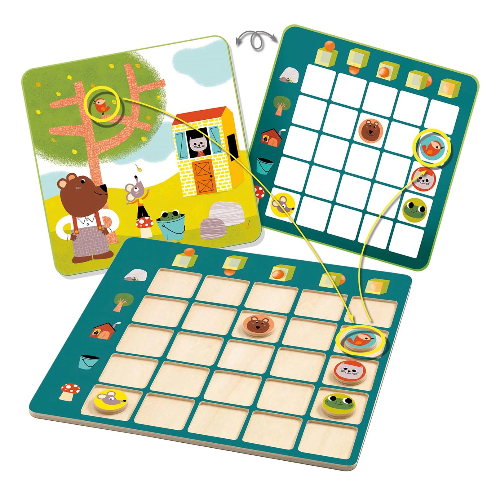 Orientacja w terenie, Topologix z serii Eduludo Djeco to zestaw zawierający 20 obrazków, czyli kart głównych, 5 żetonów ze zwierzątkami i jedną drewnianą planszę z miejscami na ułożenie żetonów. Dziecko wybiera sobie jeden obrazek, po czym odnajduje położenie głównych bohaterów i zależnie od tego,gdzie oni się znajdują wkłada żeton w konkretną przegródkę. Jest to doskonała nauka poprzez zabawę.