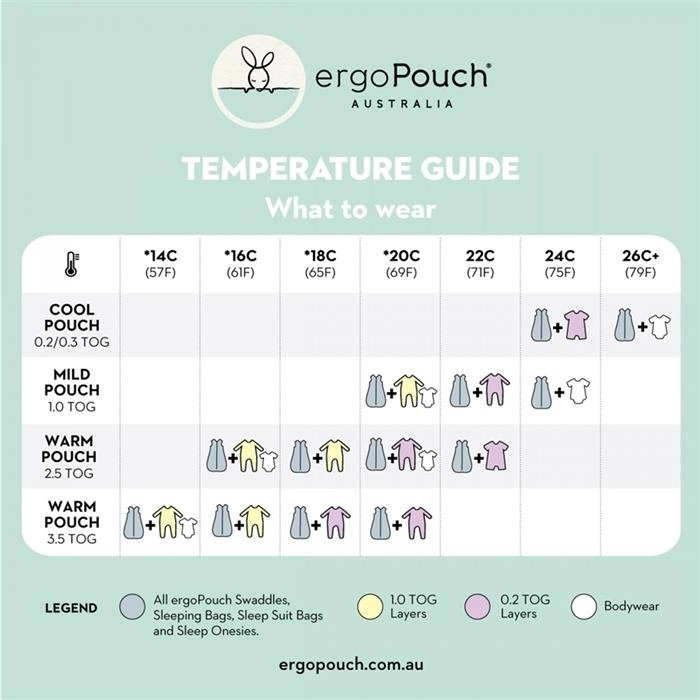 2.5 TOG sugeruje, że kokon, śpiworek lub inny produkt ergoPouch przeznaczony jest do użytkowania, kiedy temperatura w pokoju dziecka wynosi od 16°C do 22°C. By ułatwić rodzicom kontrolę temperatury w otoczeniu maluszka, do produktów ergoPouch dołączany jest termometr pokojowy.