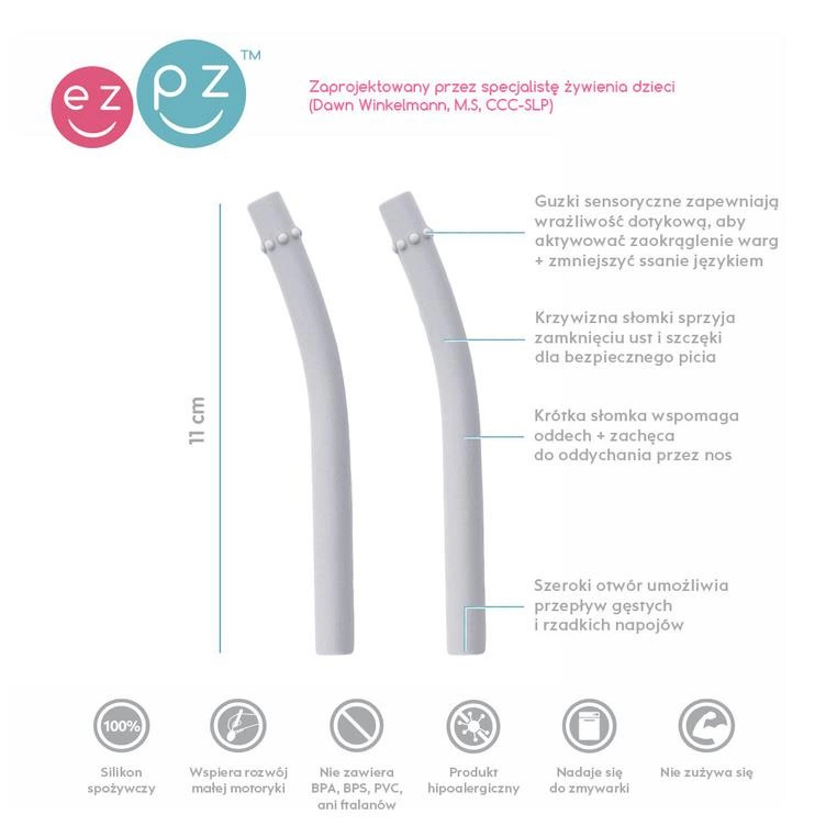 Dwie dodatkowe silikonowe słomki dedykowane są do kubeczka Mini Cup jako praktyczne akcesorium, ułatwiające korzystanie z naczynka. Słomki zostały zaprojektowane przez specjalistę w dziedzinie logopedii i żywienia tak, aby ułatwić maluszkowi naukę samodzielnego picia. Ich unikalny kształt jest doskonale dopasowany do ust i potrzeb małego człowieka. Wygięcie oraz sensoryczne wypustki w górnej części aktywują automatyczne domknięcie warg i szczęki, a optymalna długość wspiera naukę oddychania przez nos i normalizacji oddechu. Kolejnym etapem, po opanowaniu umiejętności picia przez zakrzywiony koniec słomki, jest nauka picia przez prostą słomkę – do tego służy drugi koniec bez wypustek. Szeroki przepływ (średnica słomki to niemal 1 cm!) umożliwia spożywanie napojów o zróżnicowanej gęstości. Co ważne, zaokrąglanie warg podczas używania słomki sprzyja postępom w kształtowaniu się i używaniu aparatu mowy.