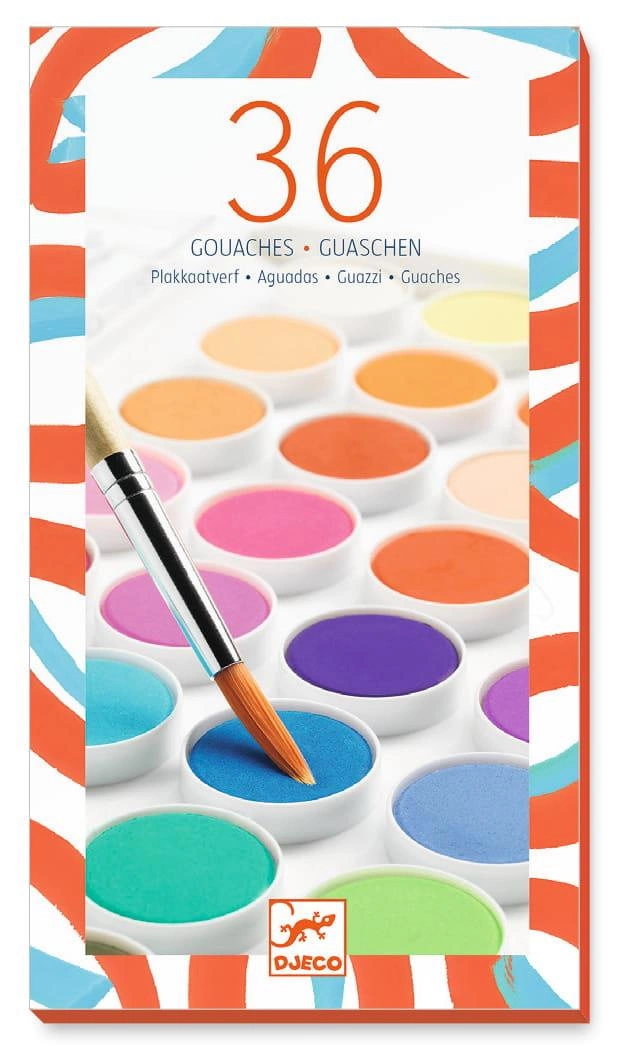 W zestawie 36 pojemniczków z farbami oraz pędzelek.