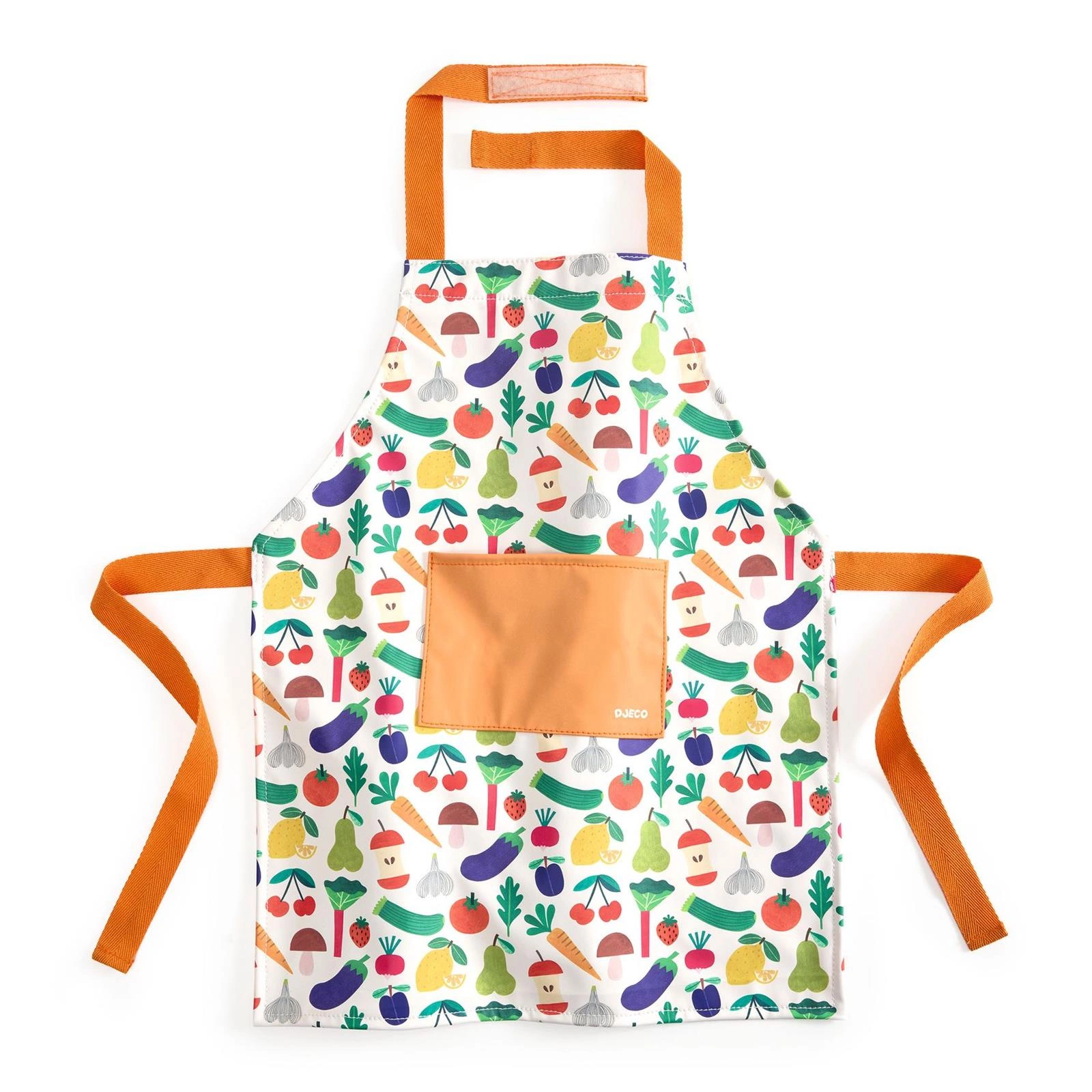 Uroczy fartuszek dla dzieci, aby pomoc w kuchni dorosłym była jeszcze bardziej atrakcyjna! Wiązany z tyłu i zakładany na szyję. Rozmiar dopasowuje się dzięki rzepowi na górnym pasku. Posiada pomarańczową kieszonkę z przodu. Cały pokryty jest drobnym wzorem przedstawiającym wielokolorowe warzywa i owoce.