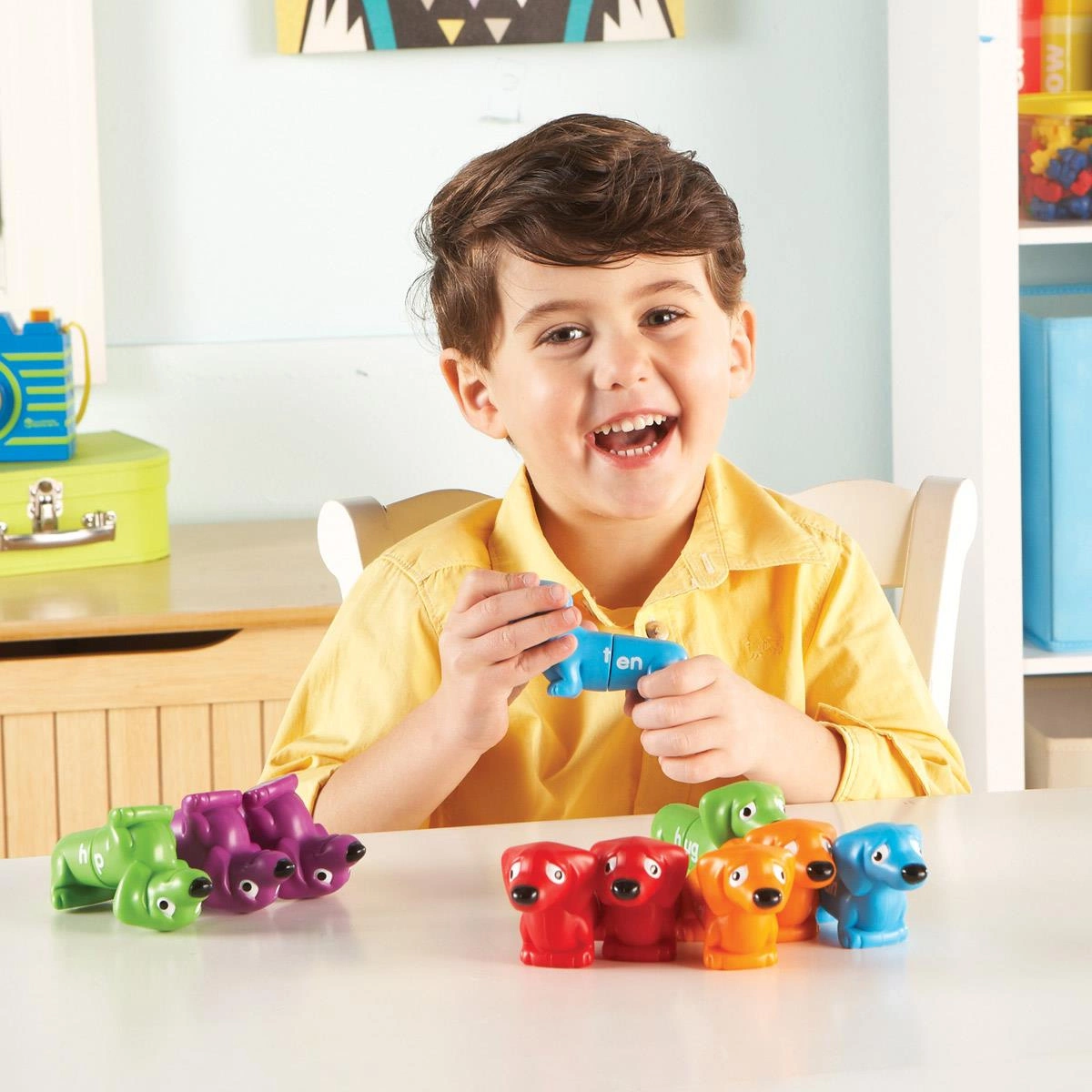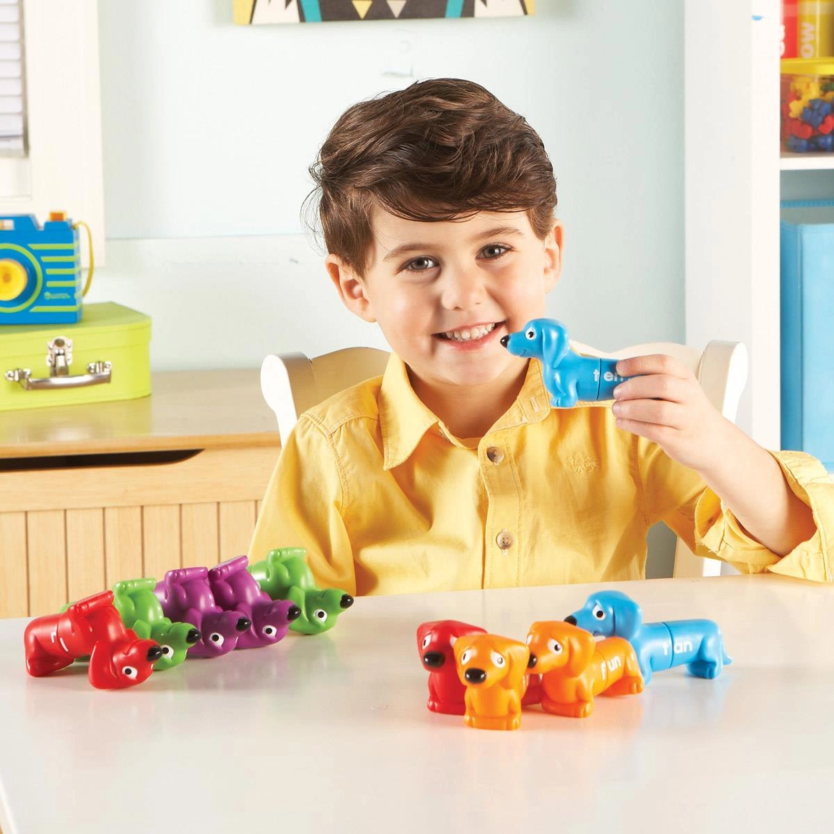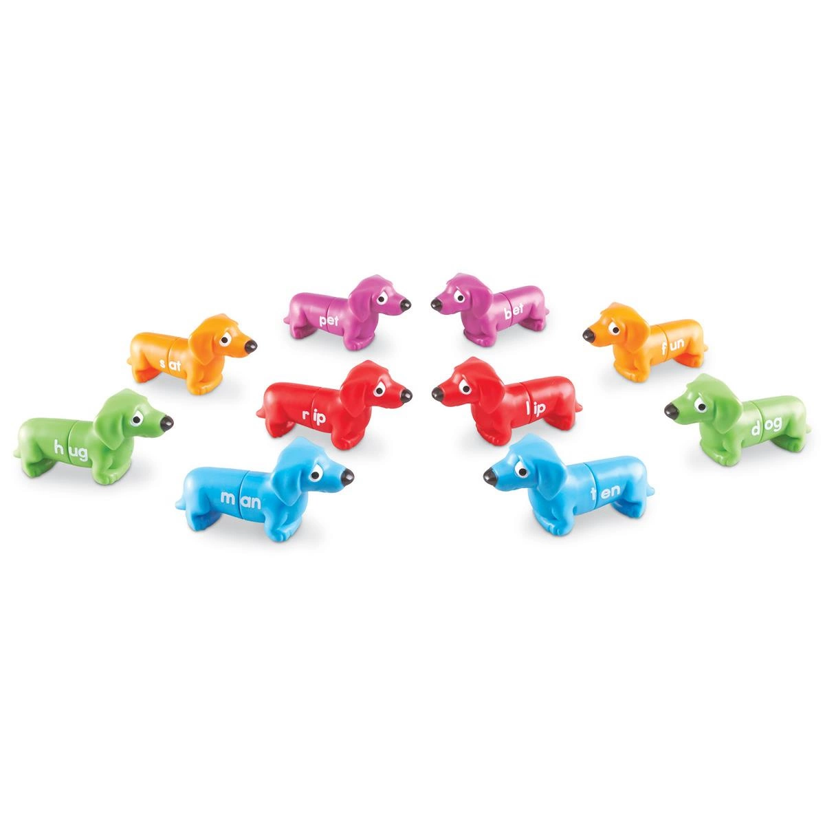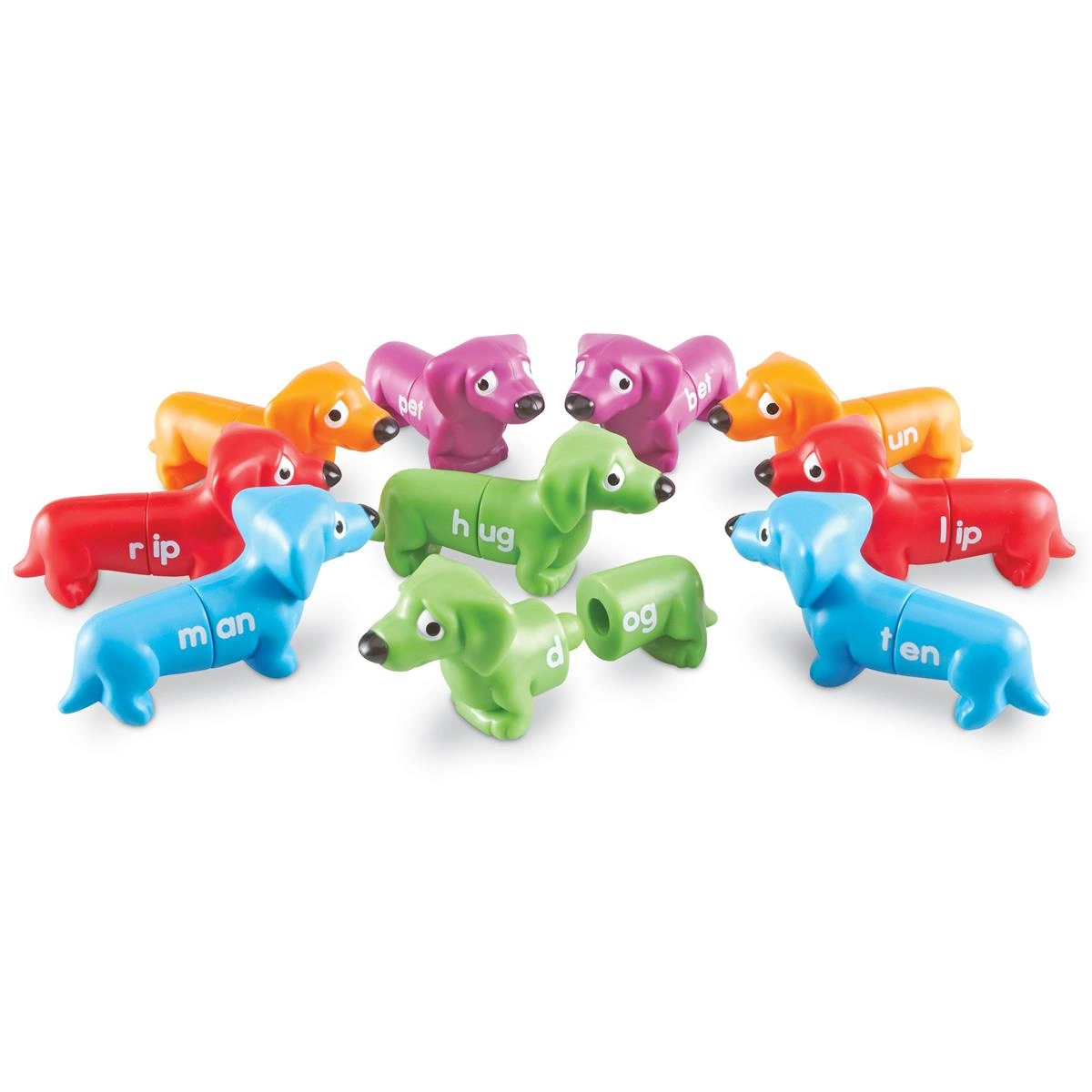 • Kolorowe głowy i ogony piesków mają litery.