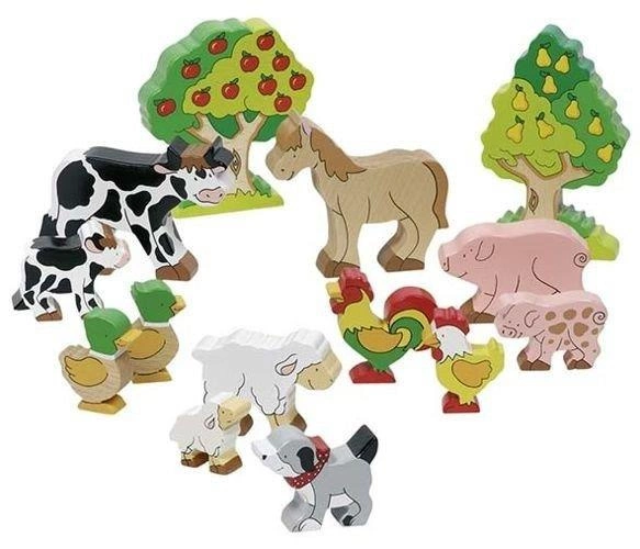 14 drewnianych figurek zwierząt to świetny początek do zabawy w farmę. Przy odrobinie wyobraźni maluch stworzy dla nich domek w swoim pokoju. Farma dla dzieci to świetna zabawa dla miłośników zwierząt.