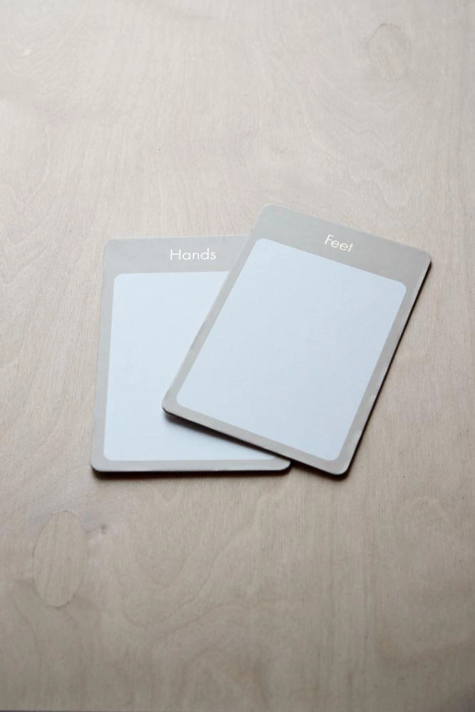 - dwie karty do odcisków pulchnych rączek i nóżek. Atrament nie jest dołączony, możesz kupić swój ulubiony kolor.