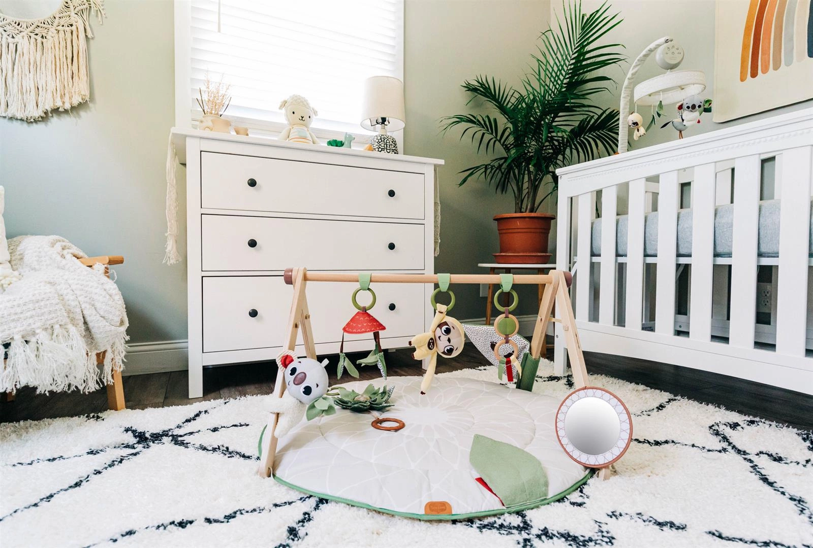 Podwójnie wyściełana, miękka mata, wykonana z wysokiej jakości materiałów i połączona z drewnianym stojakiem, wyposażonym w urocze zawieszki. W zestawie z matą znajdują się karty z miesiącami, które ułatwią Ci zrobienie pięknych zdjęć w pierwszym roku życia, miesiąc po miesiącu, tworząc urocze pamiątki. Na odwrocie karty znajduje się wskazówka rozwojowa, która pomoże Ci dowiedzieć się więcej o rozwoju dziecka na danym etapie. Każdą z zawieszek można odpiąć, przesunąć, a stojak oddzielić od maty.