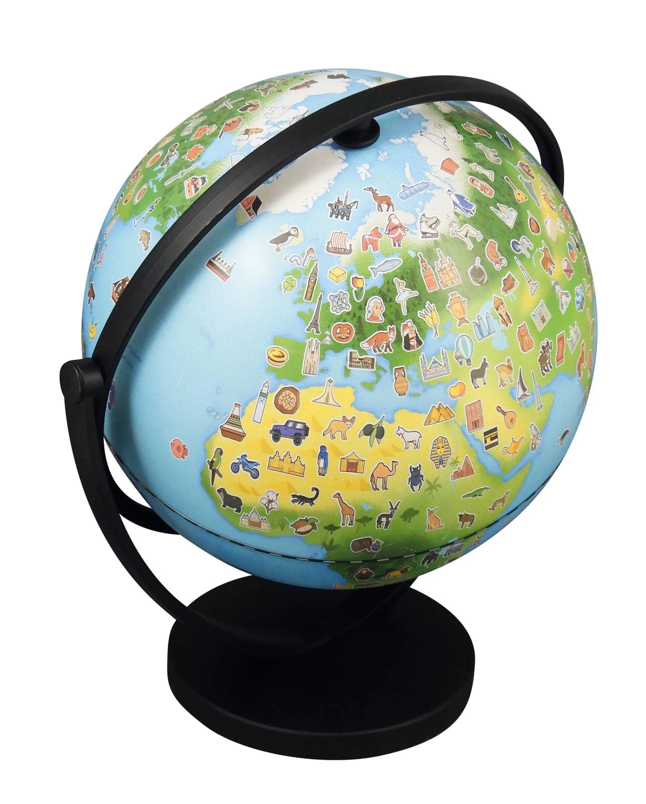 Wyjątkowy ilustrowany globus dla dzieci ciekawych świata! Mapa świata pokryta jest około 300 rysunkami: zwierząt, zabytków, dań kuchni różnych krajów itp.