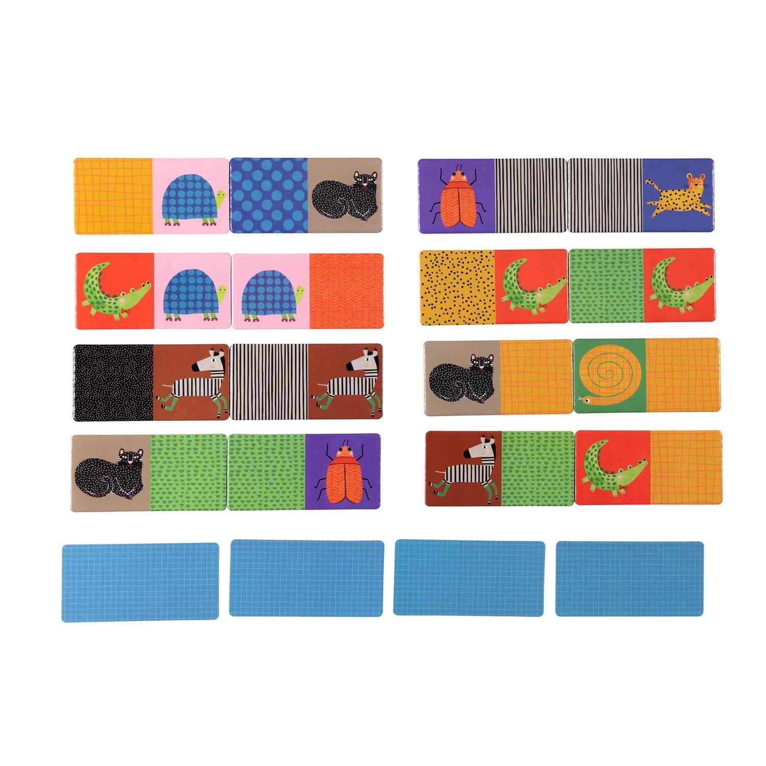 Klasyczna gra Domino w nowej odsłonie z kolekcji Les Toupitis. Celem rozgrywki jest układanie kart domina jedna po drugiej, dopasowując je na podstawie identycznych wzorów lub obrazków ze zwierzętami. Jeśli gracz A położył kartę z zielonym wzorem i zebrą, gracz B musi odnaleźć lub spróbować wylosować kartę albo z zielonym wzorem albo z zebrą. Gra toczy się dopóki któryś z graczy nie pozbędzie się wszystkich swoich kart.