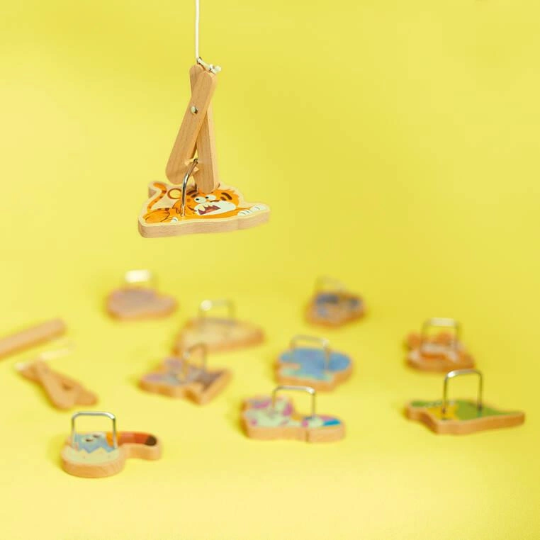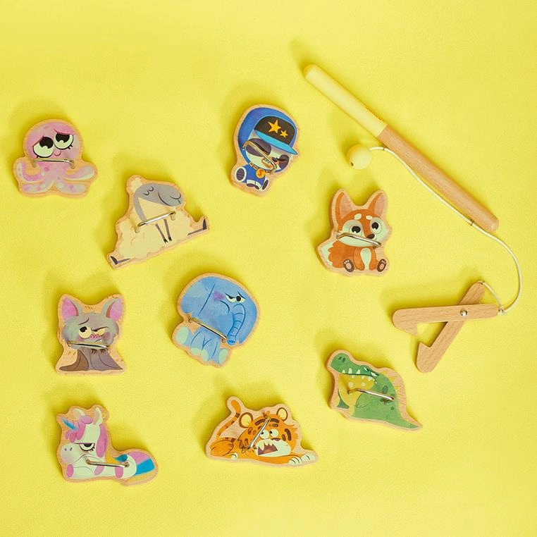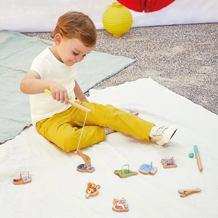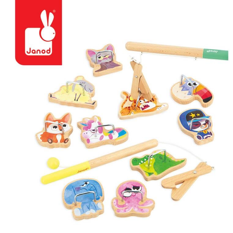 Gra zręcznościowa Łowienie rybek z kolekcji Applepop francuskiej marki JANOD to wspaniała zabawa dla dwójki dzieci lub dziecka i rodzica. W skład zestawu wchodzą dwie drewniane wędki z klipsami na końcach oraz 10 szalonych zwierząt do wyłapania. Drewniane figurki mają spore metalowe uchwyty, dzięki którym dają się złapać na klips. Celem gry jest złowienie jak największej ilości stworzeń. Gracz, który zgromadzi ich więcej – wygrywa. Gra ćwiczy koordynację ruchową, wspiera relację ręka-oko, uczy cierpliwości i skupienia.