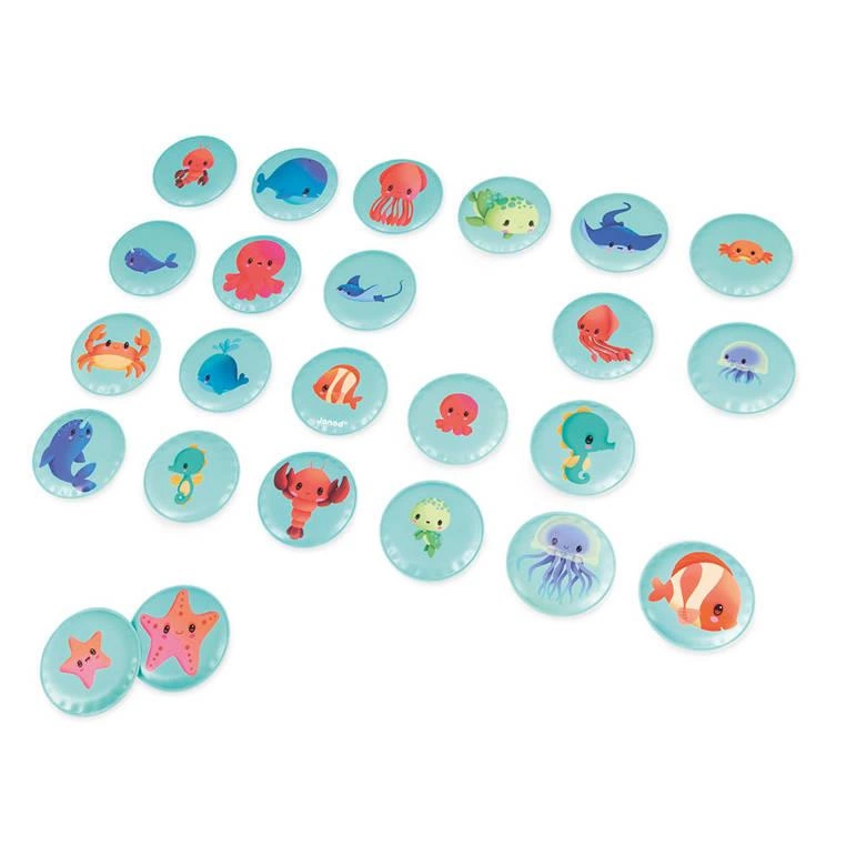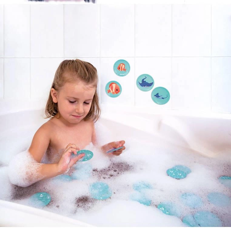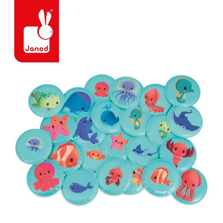 Gra pamięciowa memory francuskiej marki JANOD, przeznaczona do zabawy w kąpieli. Składa się z 24 okrągłych wodoodpornych żetonów z 12 różnymi obrazkami, które należy dobrać w pary, odkrywając je i zapamiętując ich położenie. Na żetonach znajdują się m.in. narwal, krab, płaszczka, żółw czy rozgwiazda w wersji młodej oraz już dorosłej. Zabawka ta jest idealnym umilaczem czasu, spędzanego w wannie. Zaprojektowana we Francji. Zapakowana w estetyczne pudełko z uchwytem. Idealnie nadaje się na prezent.