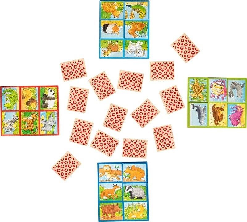 Drewniana gra pamięciowa dla dzieci Znajdź zwierzaka marki Goki to zabawa zbliżona zasadami do popularnego memo, Tutaj jednak każdy uczestnik posiada swoją planszę z wyznaczonymi zwierzaczkami, a na środku leżą odwrócone karty, zadaniem jest odkrycie i zapamiętanie ich miejsca, kto przyporządkuje najszybciej zwierzaki, wygrywa. W zabawie mogą wziąć udział jednocześnie 4 osoby.