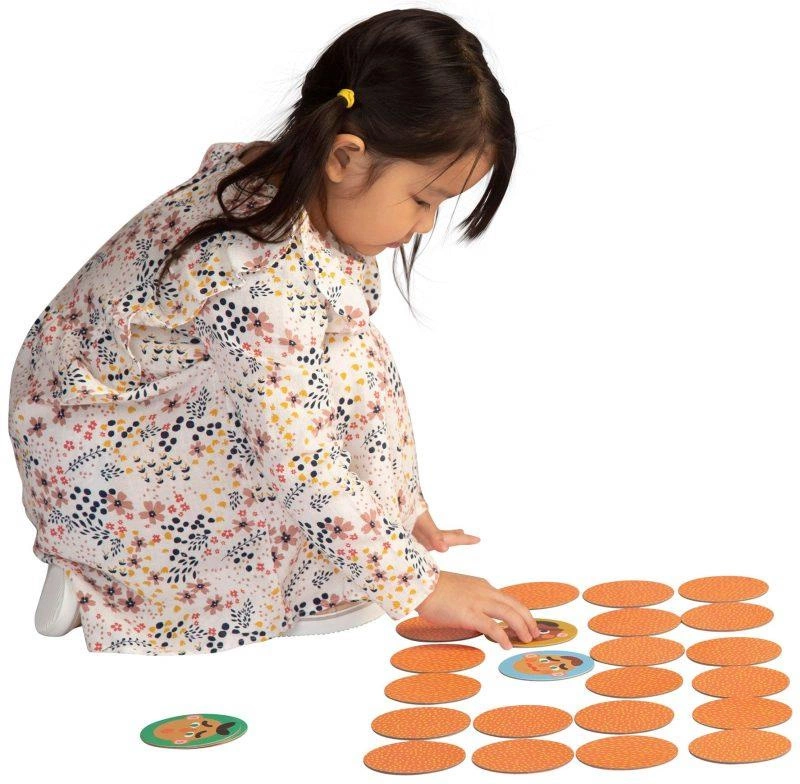 Zadaniem dziecka jest odnalezienie pary obrazków poprzez odkrywanie i odkładanie ich z powrotem w to samo miejsce. Gra pamięciowa Making Faces z Manhattan Toy zawiera 24 karty z kolorowymi twarzami wyrażającymi różne emocje, spakowanych w tubę. Dziecko ma za zadanie złożyć 12 pasujących do siebie par.