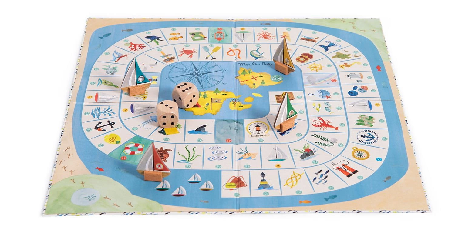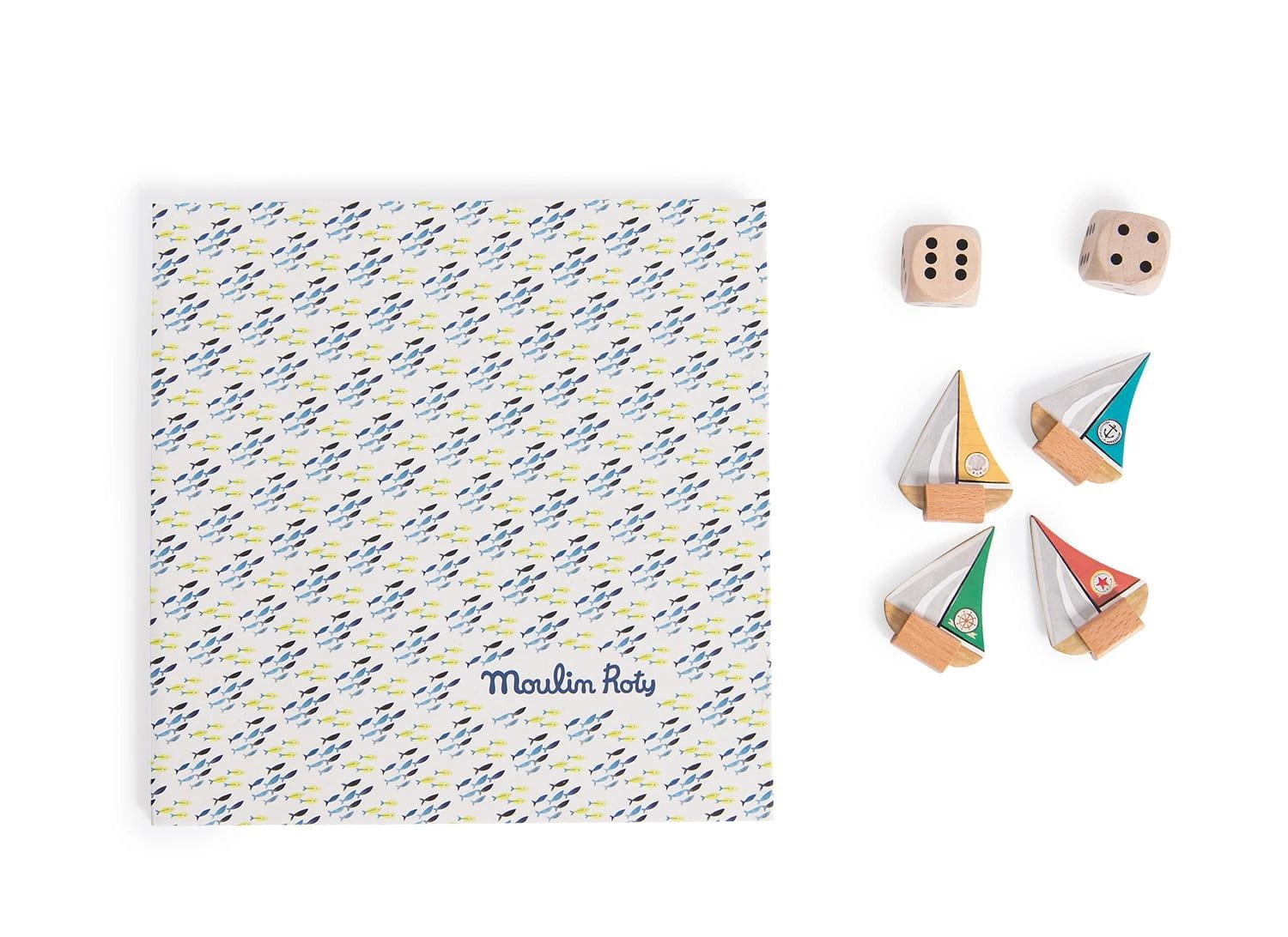 Gra zawiera 4 łodzie, 2 duże kostki i ilustrowaną akwarelą planszę.
