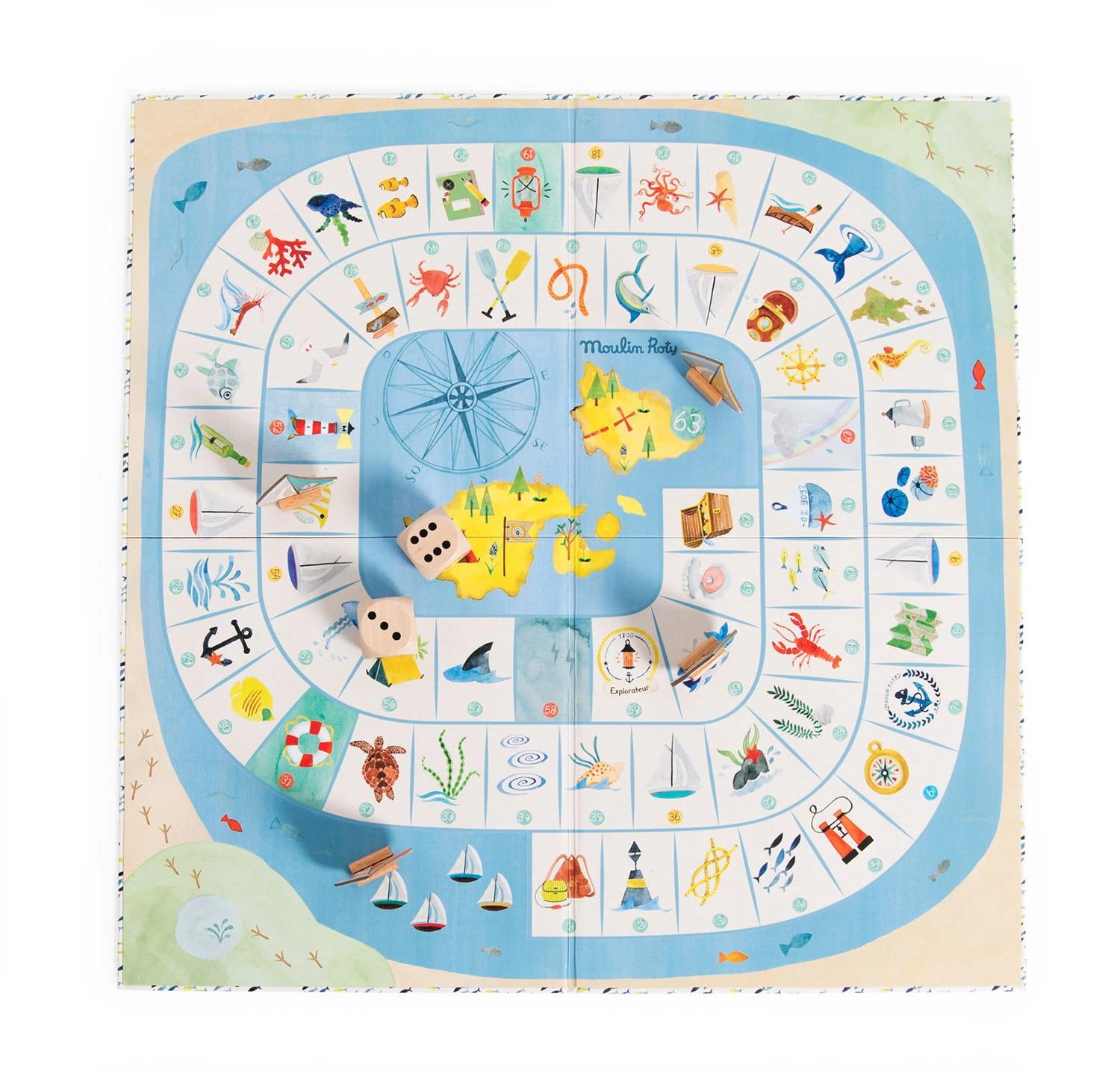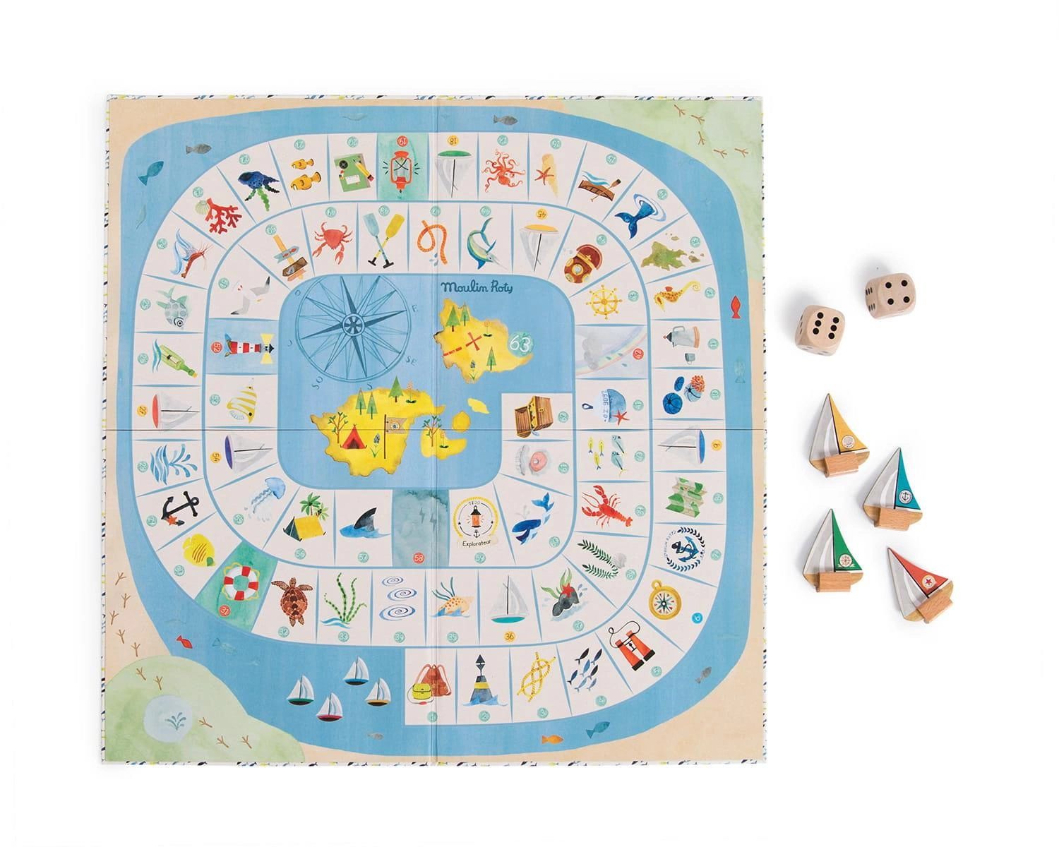 Zmieniona wersja francuskiej gry „gęsi” zabierze graczy na wycieczkę łodzią na wyspę skarbów.Specjalna wersja „węży i drabin” gra-odkrywców z zabawnym rybami i niebezpiecznymi wirami... Podnieś żagle i zacznij grę, pierwsza osoba, która dotrze na wyspę, wygrywa skarb.