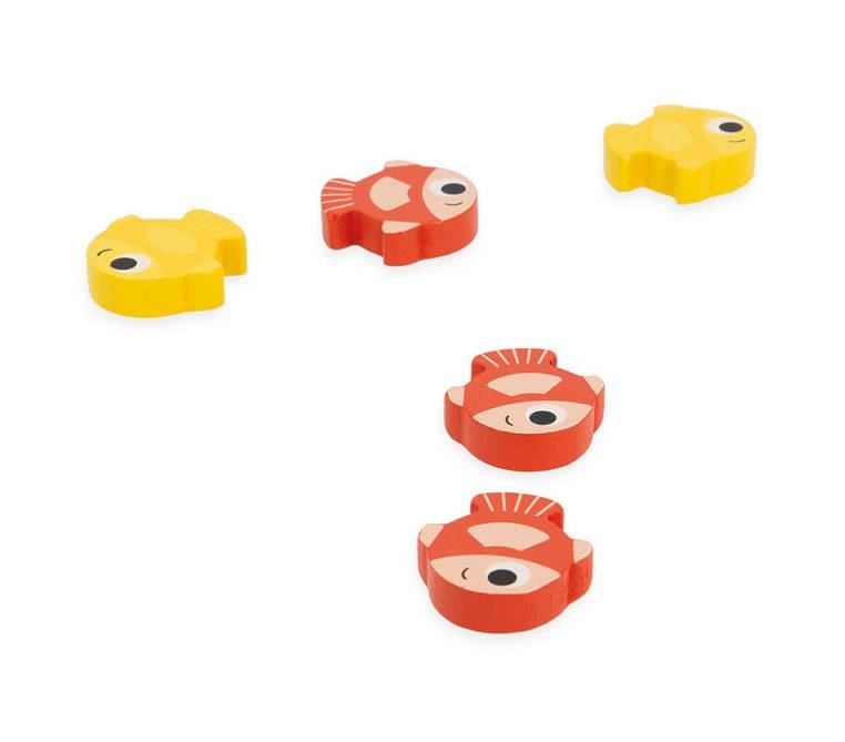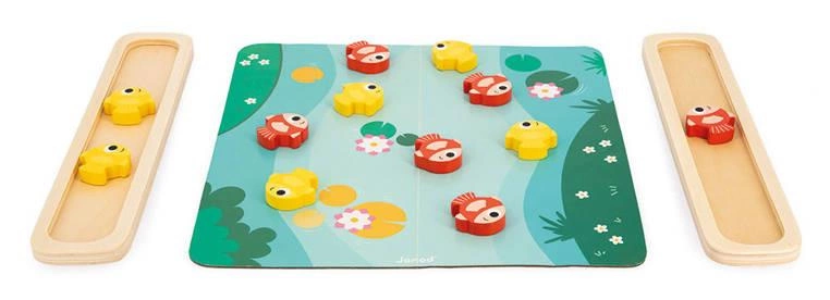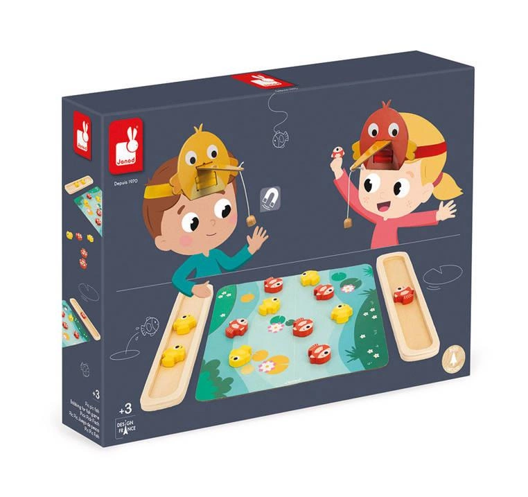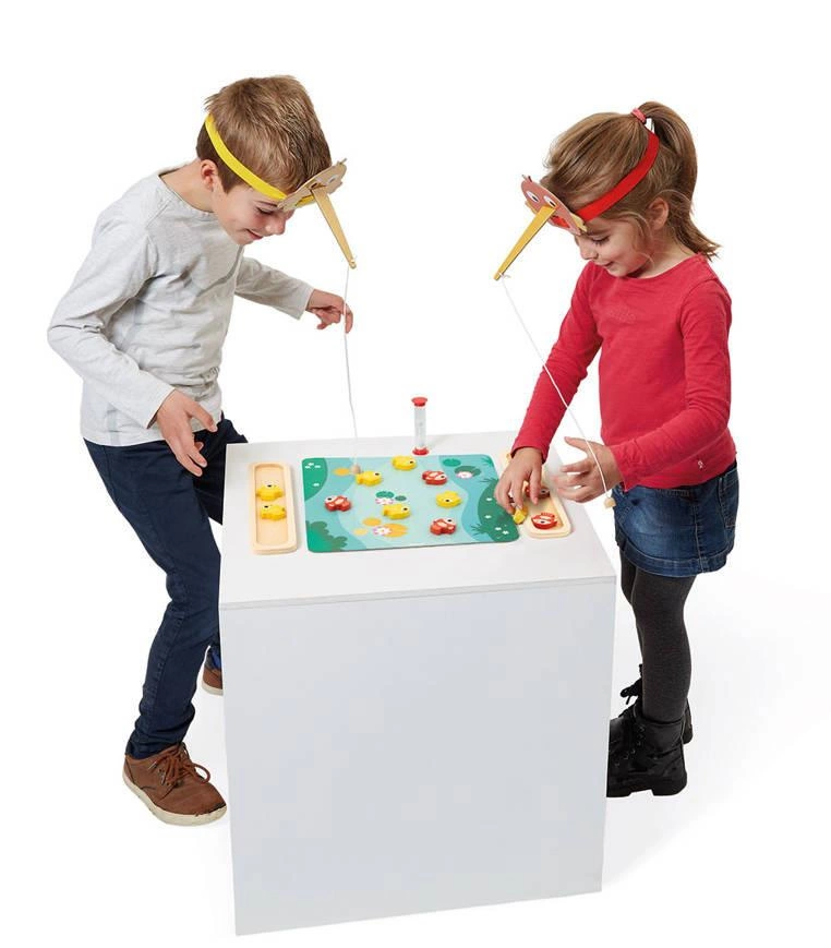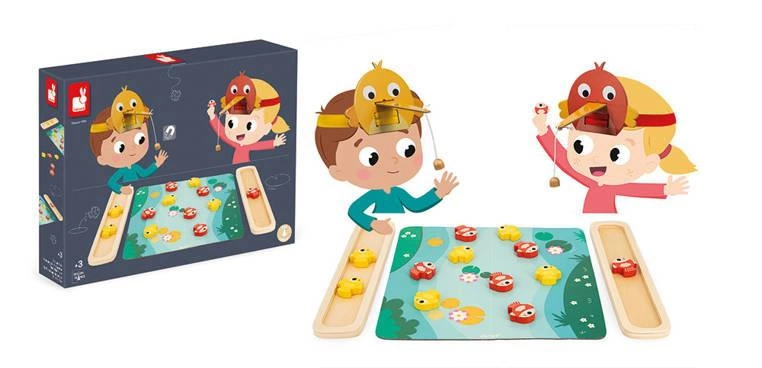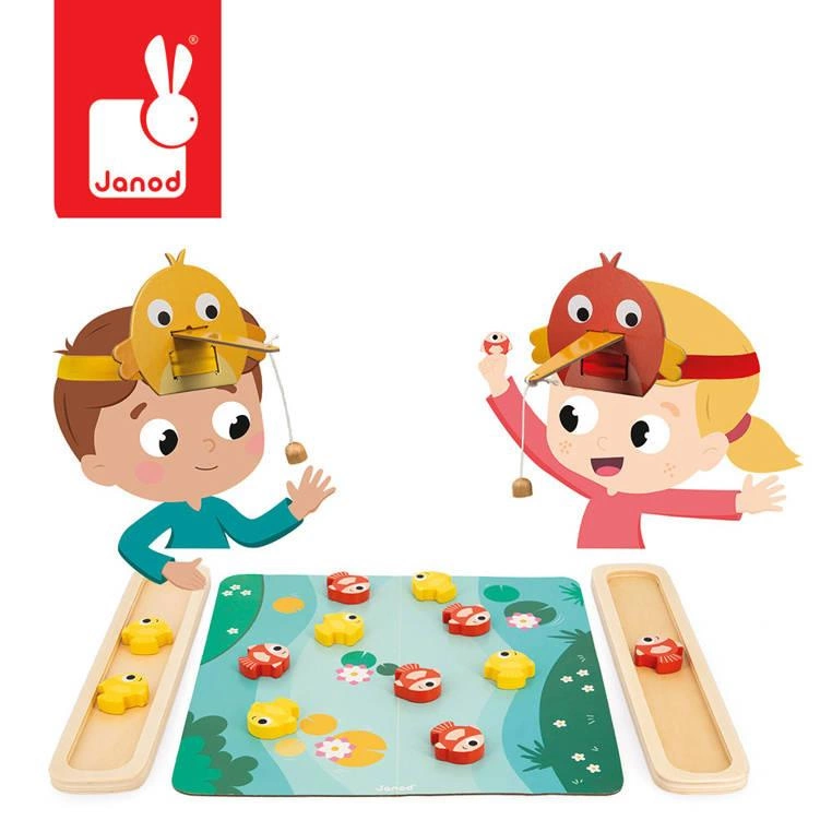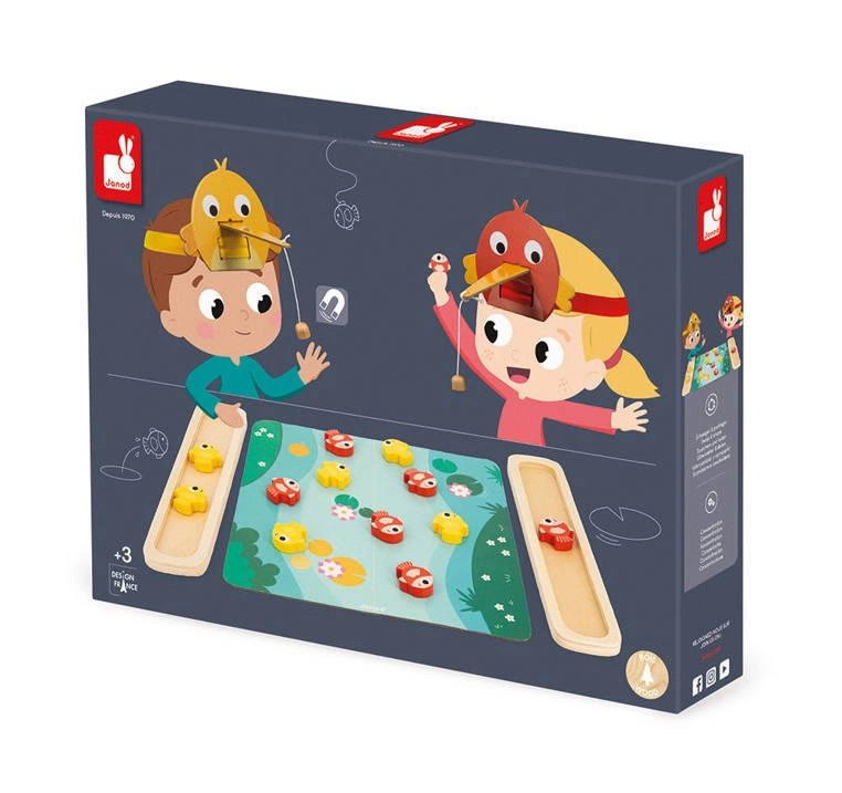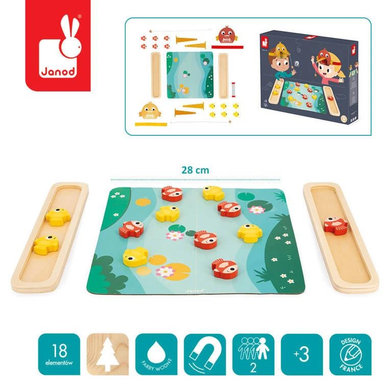 Gra zręcznościowa Łowienie ryb francuskiej marki JANOD to wspaniała zabawa dla dwójki dzieci lub dziecka i rodzica. W skład zestawu wchodzi drewniana plansza z kartonowym stawem i dwoma korytkami na złowione rybki, 12 rybek (po 6 w dwóch kolorach: czerwonym i żółtym), dwie maski ptaszków (w kolorach rybek) na elastycznych gumkach z magnetycznymi wędkami przy dziobach oraz klepsydra do odmierzania czasu (30 sekund). Celem gry jest wyłowienie (na magnes) ze stawu wszystkich rybek w swoim kolorze. Gracz, który zrobi to jako pierwszy – wygrywa. Gra ta ćwiczy koordynację ruchową, wspiera relację ręka-oko, uczy cierpliwości i skupienia.