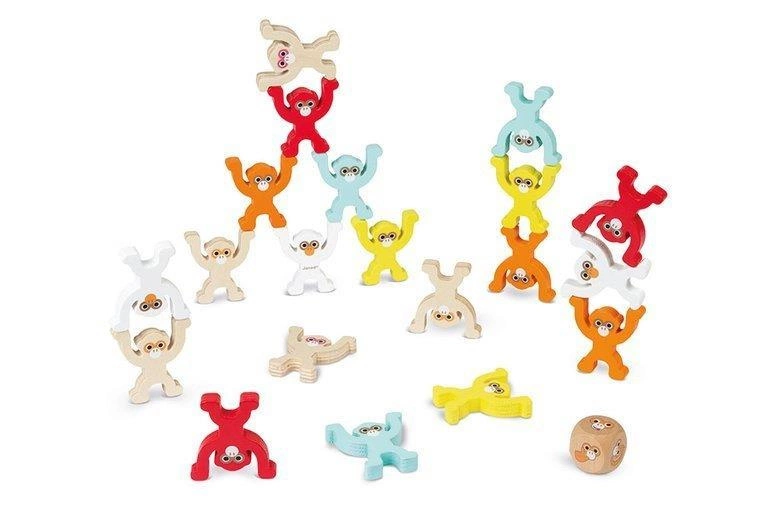 Gra zręcznościowa Małpia piramida francuskiej marki JANOD to wspaniała zabawa, zarówno dla dzieci, jak i ich rodziców (od 2 do 5 osób). W skład zestawu wchodzi 20 drewnianych małpek w 6 kolorach (naturalnego drewna, białym, żółtym, pomarańczowym, czerwonym i jasnoniebieskim) oraz 1 drewniana kostka z ilustracjami, które obrazują sposób, w jaki należy ustawiać kolejne figury na konstrukcji. Celem gry jest ułożenie jak najwyższej i stabilnej piramidy z małpek. Gracz, który doprowadzi do jej upadku – przegrywa. Gra ta ćwiczy koordynację ruchową, wspiera relację ręka-oko, uczy cierpliwości i skupienia.