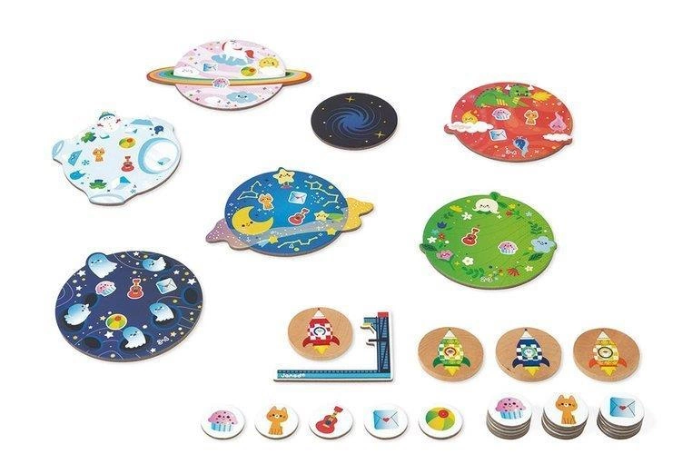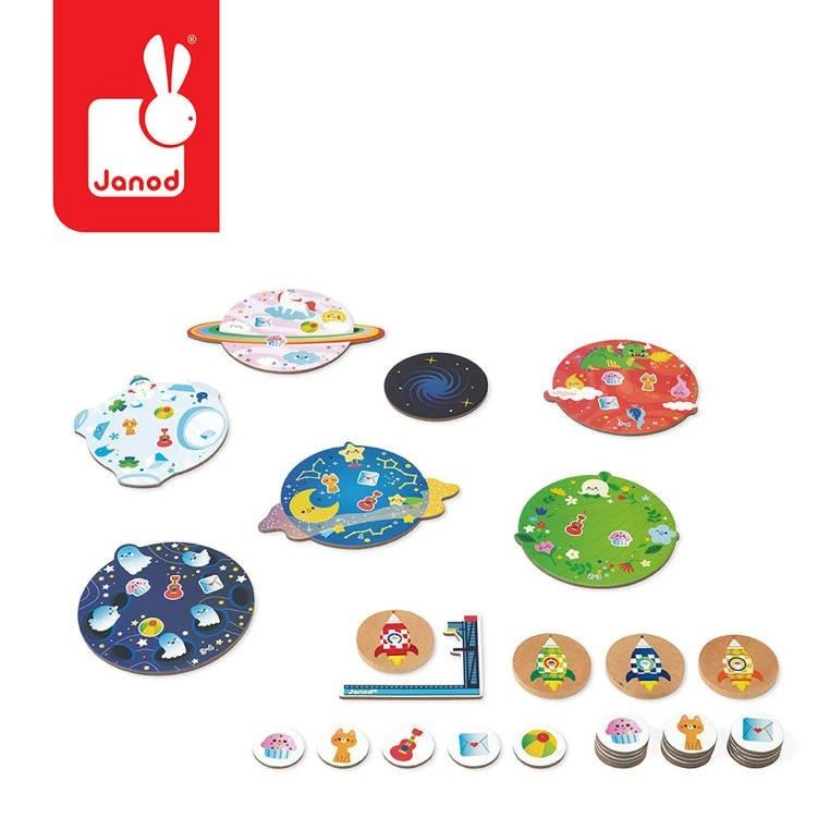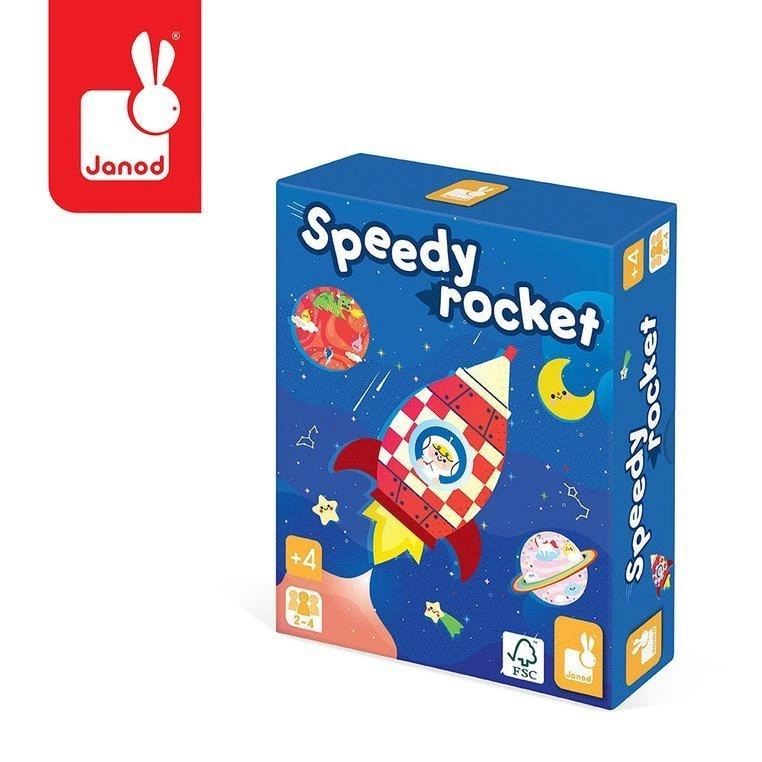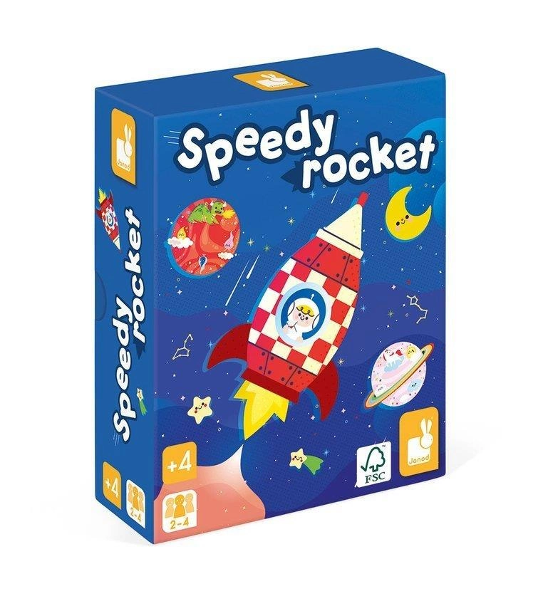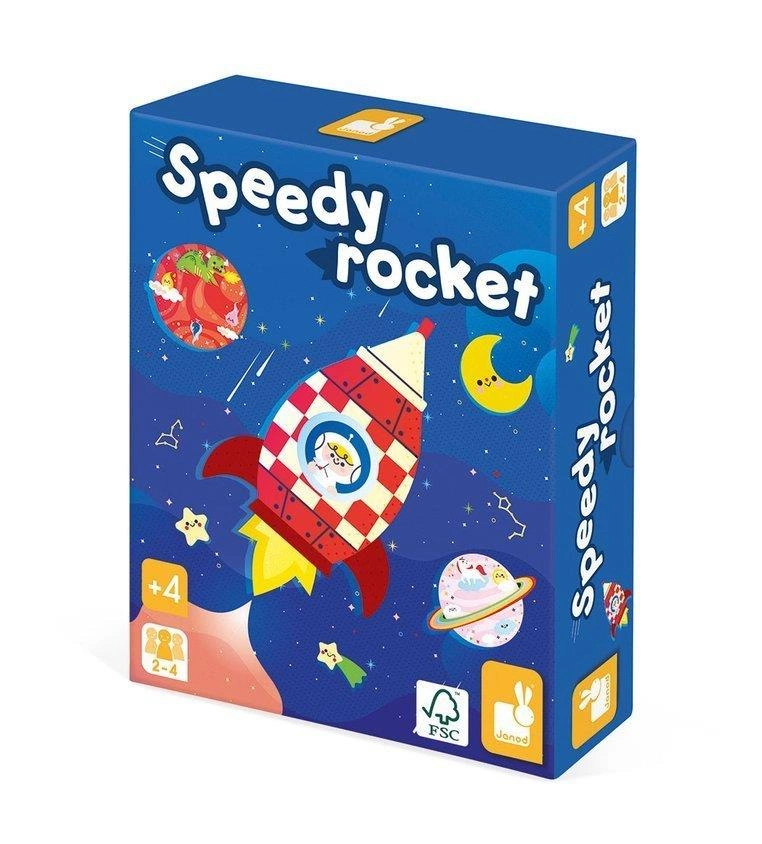 Gra zręcznościowa Rakieta francuskiej marki JANOD to wspaniała zabawa zarówno dla dzieci, jak i rodziców. W skład zestawu wchodzi 6 kartonowych planet, 1 czarna dziura i 1 rampa startowa, 4 drewniane krążki-rakiety oraz 20 kartonowych żetonów z ilustracjami zasobów, które należy dzięki rakietom dostarczyć na planety. Celem gry jest zaopatrzenie planet, wysyłając ładunek na rakietach poprzez pstrykanie w nie palcami z miejsca przy wyrzutni w stronę odpowiedniej planety. Gracz, który jako pierwszy dostarczy swoje żetony z ekwipunkiem – wygrywa. Gra ta ćwiczy koordynację ruchową, wspiera relację ręka-oko, uczy cierpliwości i skupienia.