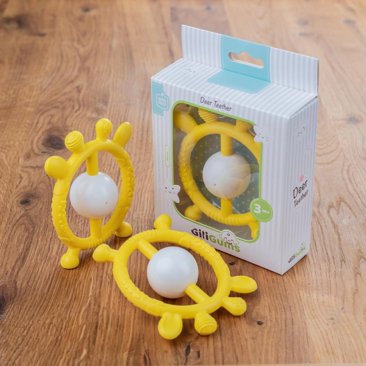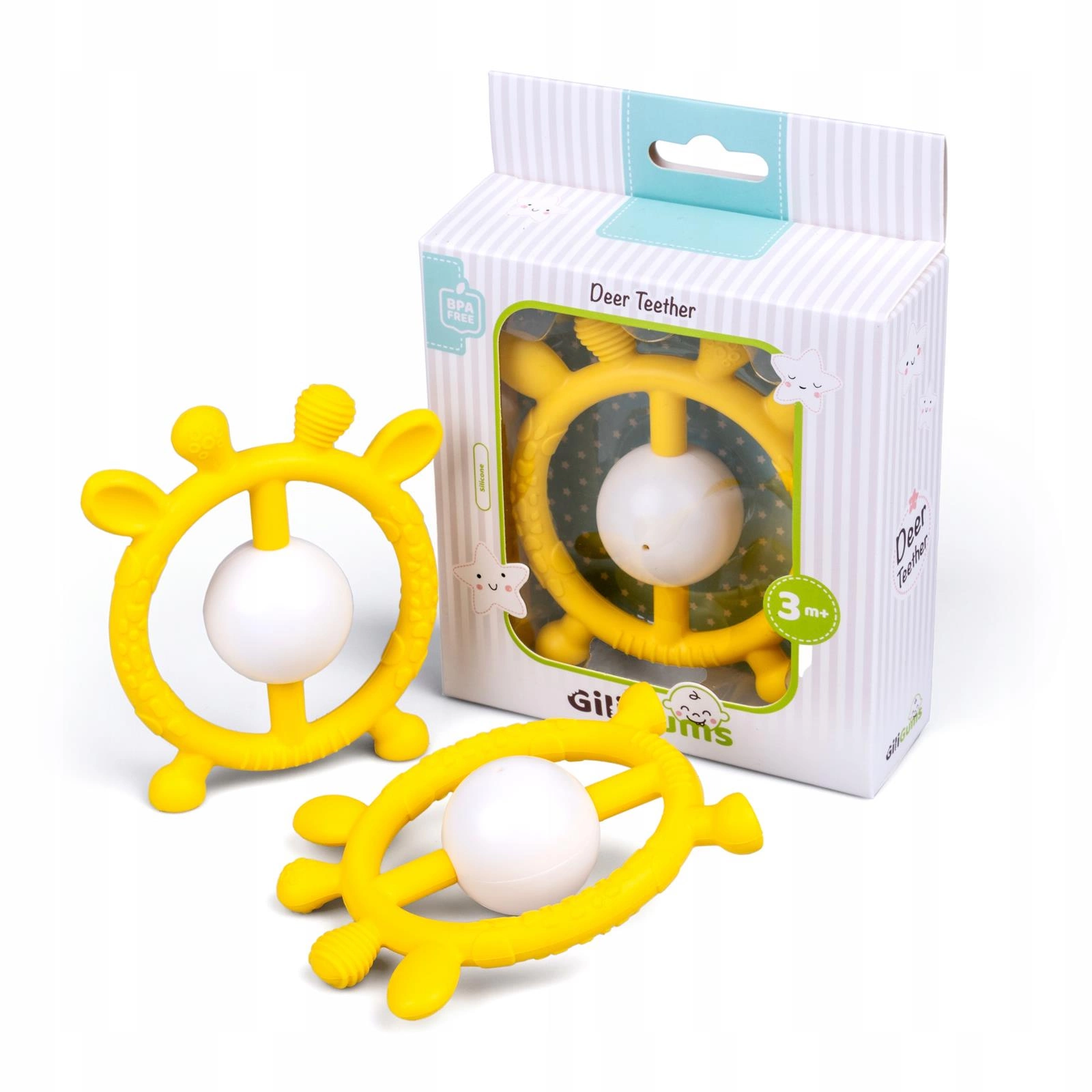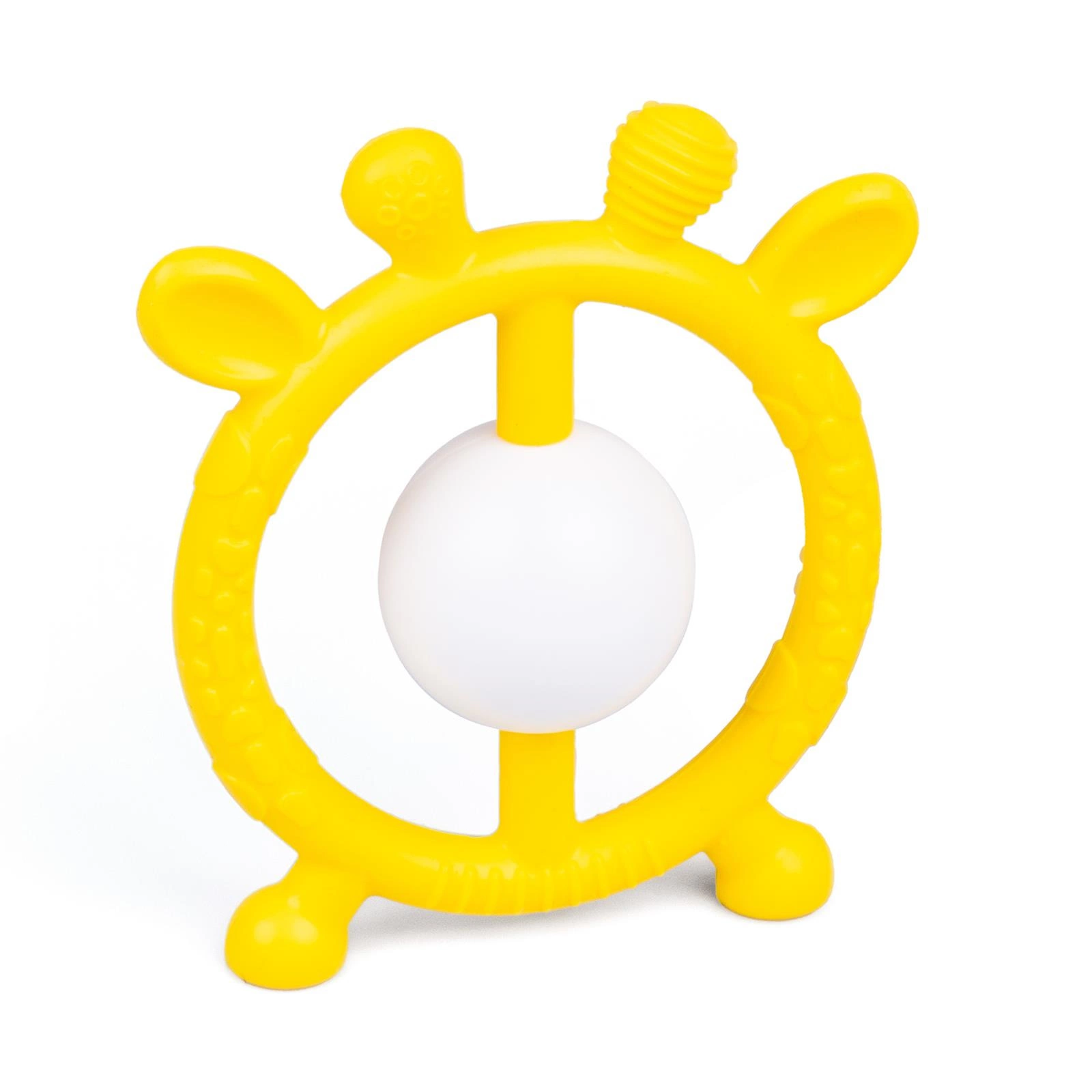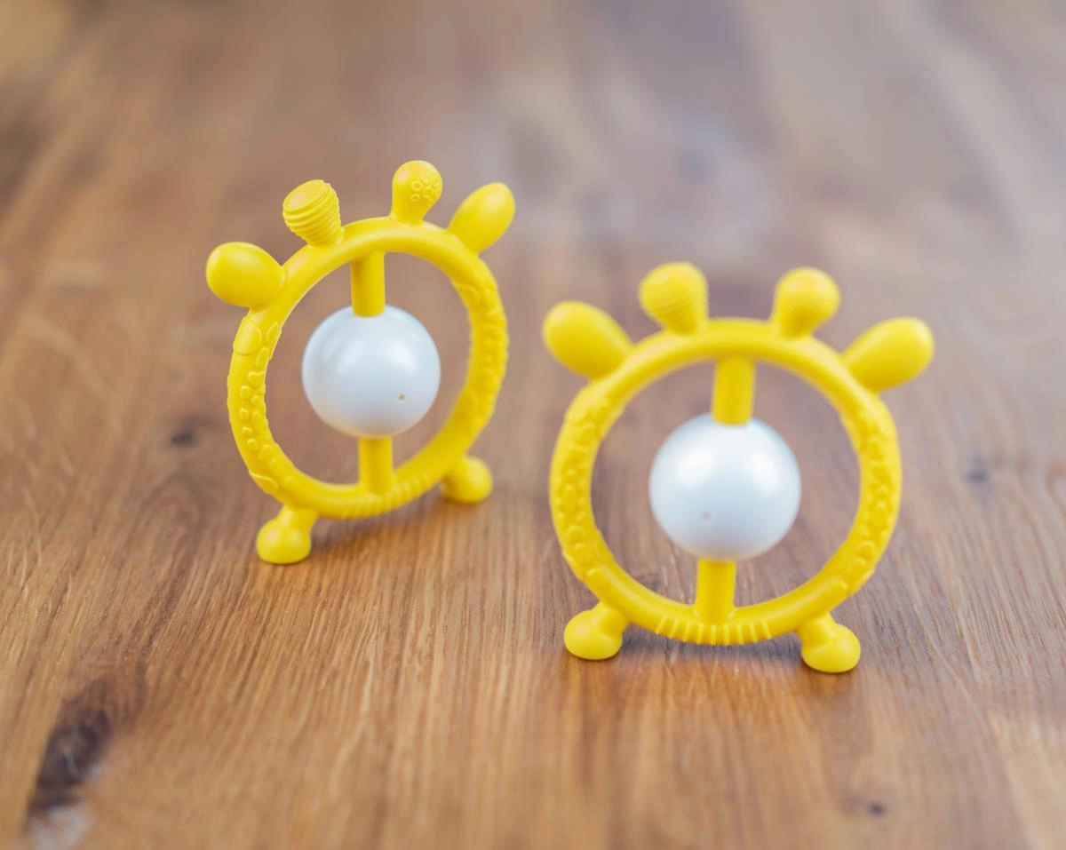 Gryzaczek i grzechotka w jednym! Ten wesoły jelonek w pięknym, słonecznym kolorze przyniesie ulgę ząbkującemu maluszkowi.
