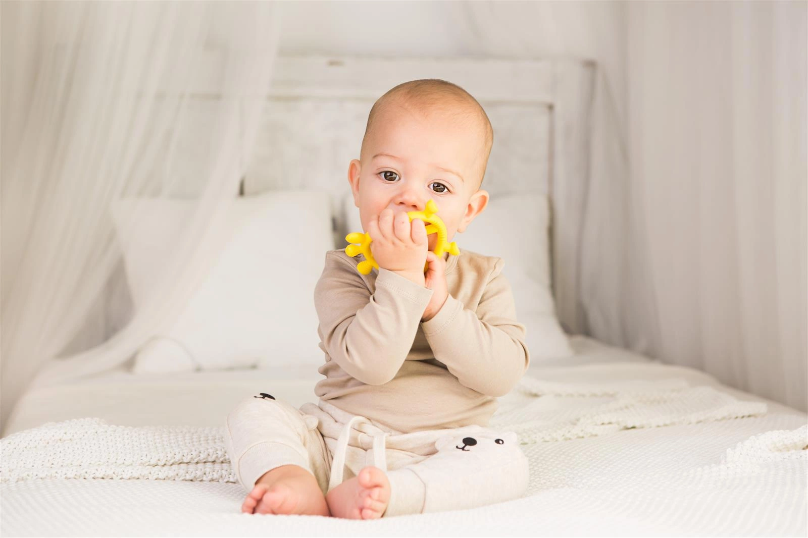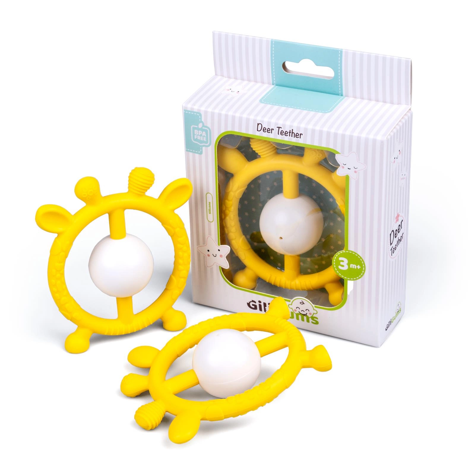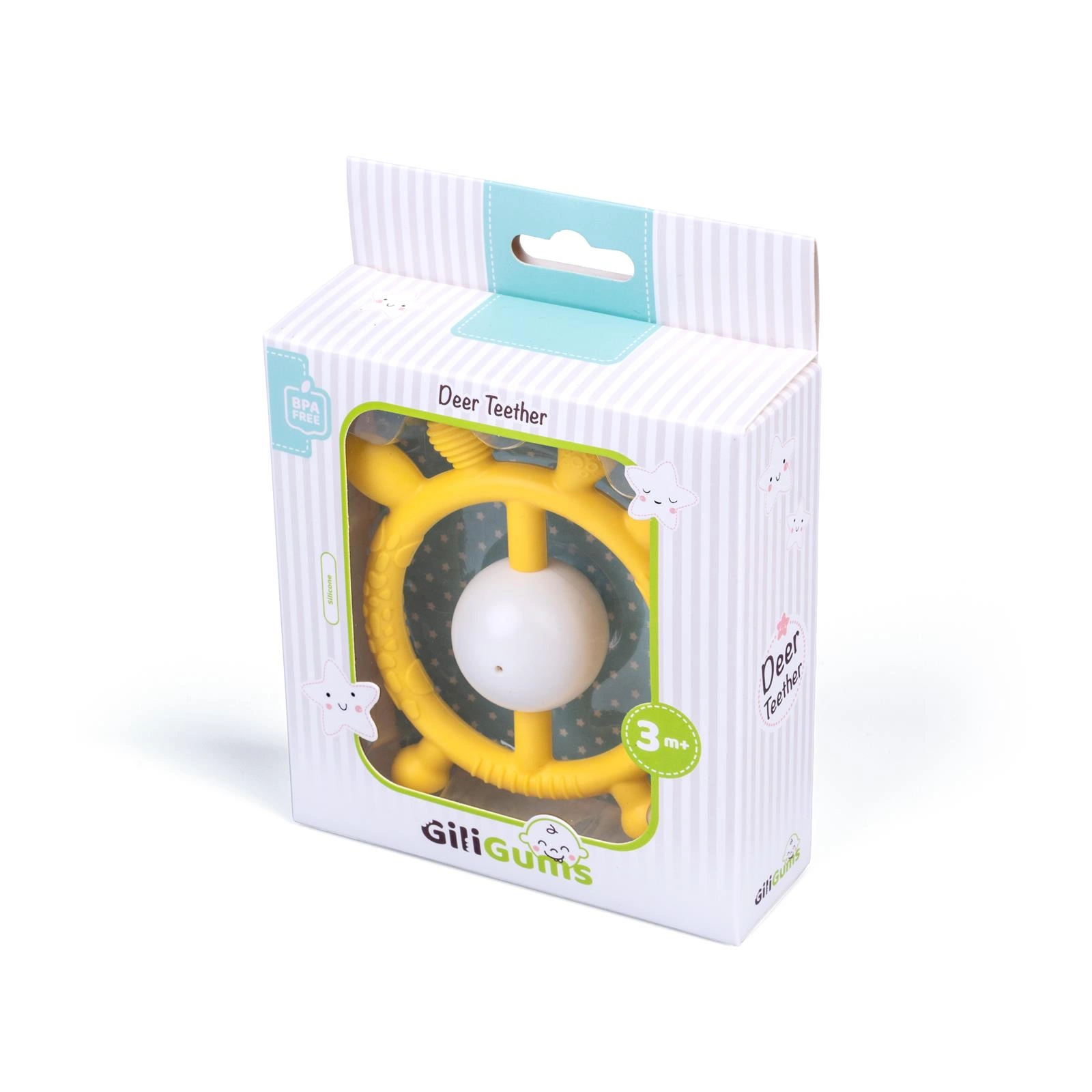 Gryzaczek i grzechotka w jednym! Ten wesoły jelonek w pięknym, słonecznym kolorze przyniesie ulgę ząbkującemu maluszkowi.