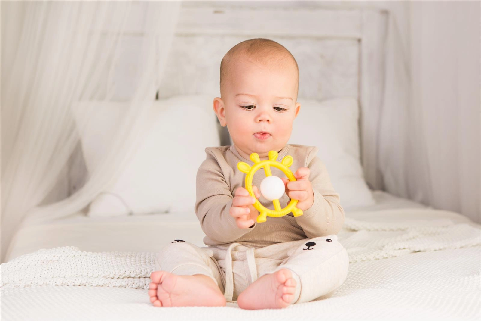 Zróżnicowane faktury gryzaka delikatnie masują dziąsła, a jego kształt ułatwia małym rączkom chwytanie zabawki.