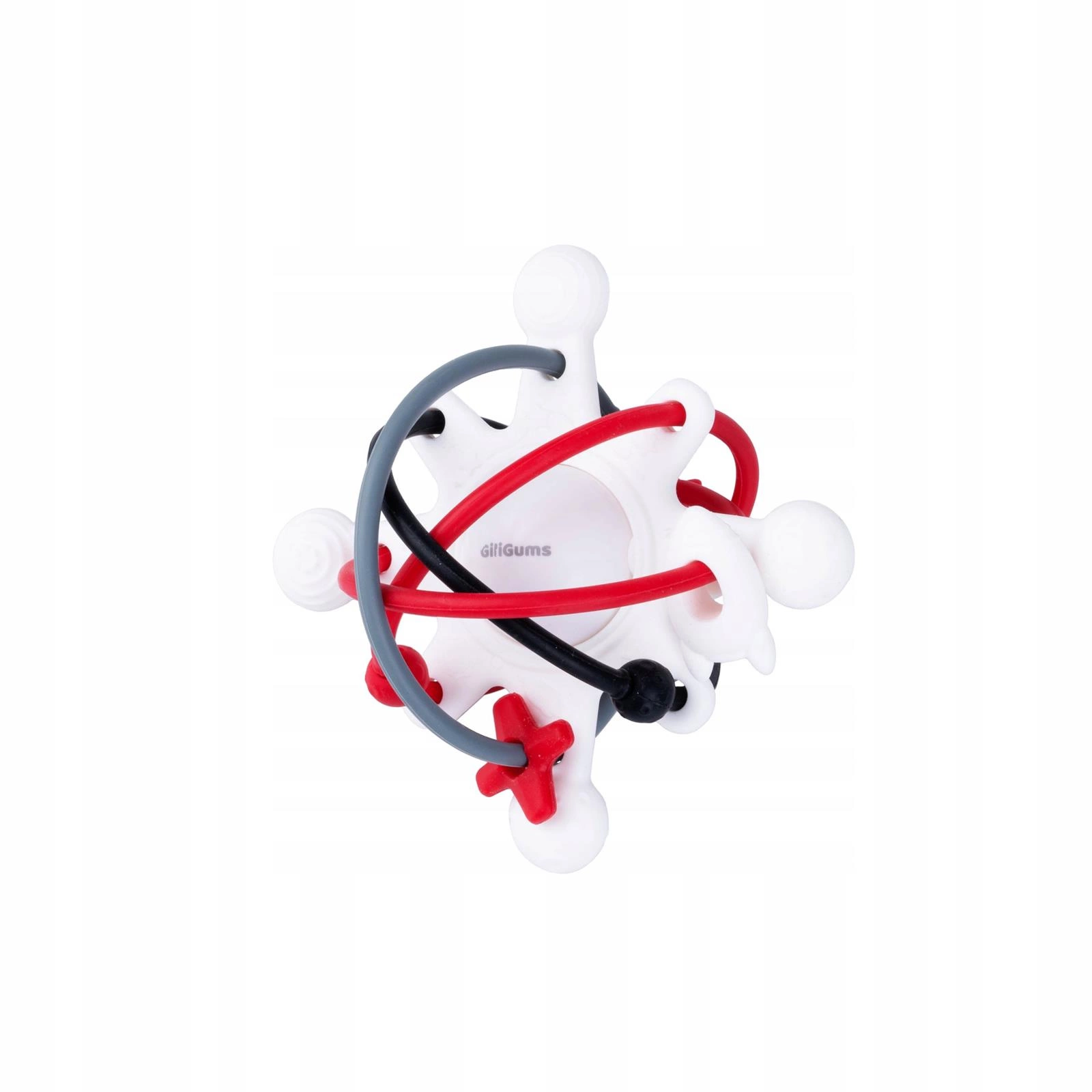 Grzechotka kosmos kontrastowa - GiliGums Kosmiczna grzechotka to moc odlotowej zabawy w stylowej odsłonie! Zabawka posiada w swym wnętrzu  kuleczkę, która grzechocze przy potrząsaniu. Naokoło niej znajdują się miękkie linki a ruchomymi elementami do przesuwania. Jakby tego było mało, zabawka wyposażona została także w wypustki, przez co sprawdzi się również w roli gryzaka. Jej kształt pasuje idealnie do rączek malucha, co ułatwia najmłodszym chwytanie grzechotki.