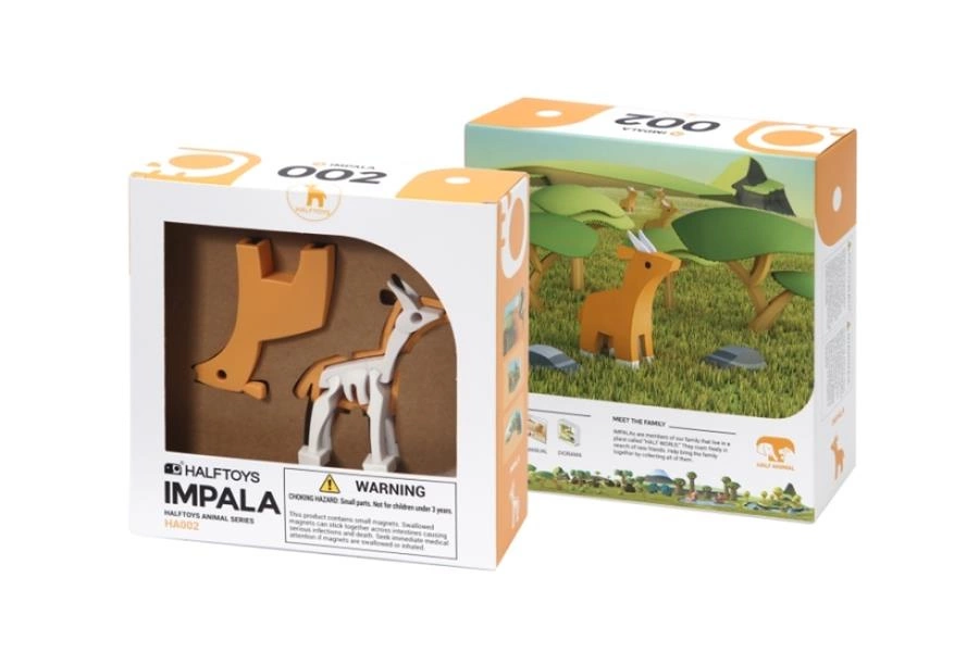 Zabawki HalfToys to niezwykłe połączenie estetyki i interaktywnej zabawy. Każde zwierzę skrywa w sobie układankę 3D z realistycznym szkieletem, ukrytym pod magnetyczną powierzchnią. Minimalistyczny design i edukacyjny charakter sprawiają, że są one zarówno zabawkami, jak i wyjątkowymi elementami kolekcji. Magnetyczna Składana Antylopa Impala to pięknie zaprojektowana figurka, łącząca kreatywną zabawę z nauką. Pod magnetyczną skorupą znajduje się realistyczny szkielet do samodzielnego ułożenia. Dzięki wbudowanym magnesom elementy łatwo się łączą, tworząc unikalną układankę 3D. W zestawie znajduje się również makieta sawanny z tłem i drzewami, którą można samodzielnie złożyć.