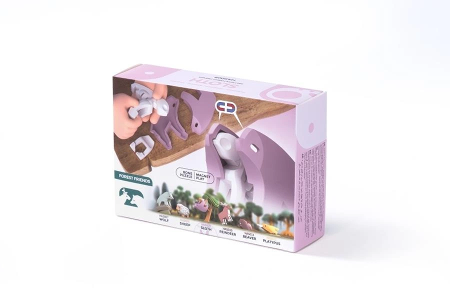- 5 elementów, w tym: 2 magnetyczne połówki tworzące „skórę” leniwca, 3 elementy układanki 3D odwzorowujące jego szkielet.