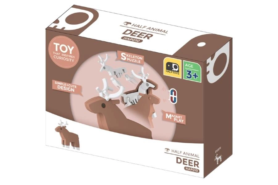 Zabawki HalfToys wyróżniają się unikalnym połączeniem estetyki i funkcjonalności. Każde zwierzątko skrywa pod magnetyczną powierzchnią realistyczny szkielet do ułożenia, tworząc interaktywną układankę 3D. Ich minimalistyczny design sprawia, że są nie tylko zabawkami, ale także pięknymi przedmiotami kolekcjonerskimi. Magnetyczny Składany Renifer to wyjątkowa zabawka, łącząca edukację z interaktywną zabawą. Pod magnetyczną skorupą kryje się szczegółowy szkielet, który można samodzielnie złożyć. Dzięki wbudowanym magnesom poszczególne elementy utrzymują się razem, tworząc spójną całość.