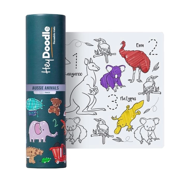 Silikonowa mata A4 przedstawia różne zwierzęta Australii oraz cyferki do pisania po śladzie. Po skończonej zabawie wystarczy przetrzeć ją wilgotną ściereczką i można zaczynać od nowa – kolorować, pisać i uczyć się bez końca!
