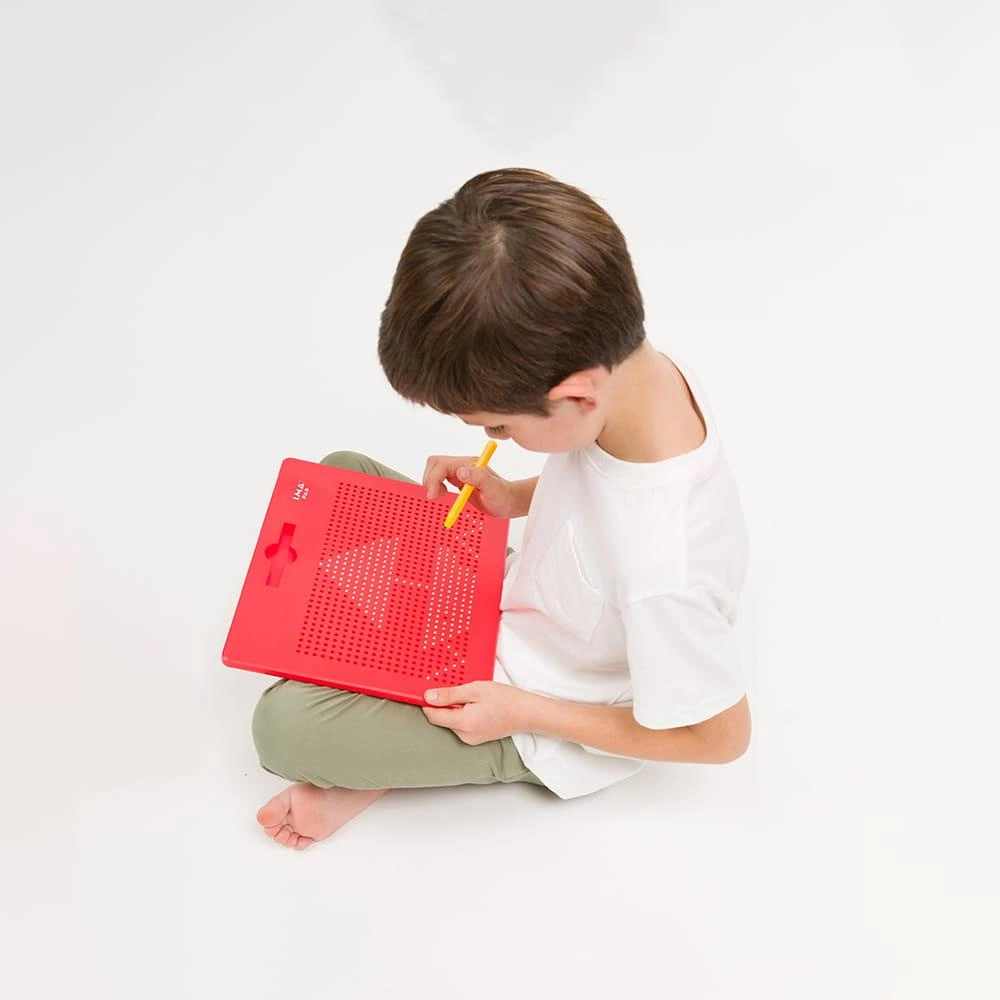 Tablica magnetyczna Imapad to idealny sposób na nudę! Za pomocą dołączonego, magnetycznego rysika dzieci "rysują" obrazki. Tablica posiada dziurki, z których wydobywa się magnetyczne kuleczki, które razem tworzą wybrane dzieło. Zabawka jest w pełni bezpieczna: otwory są na tyle duże, aby kuleczka była widoczna, ale na tyle małe, aby nie miała możliwości wypaść.
