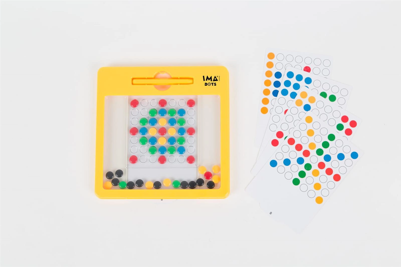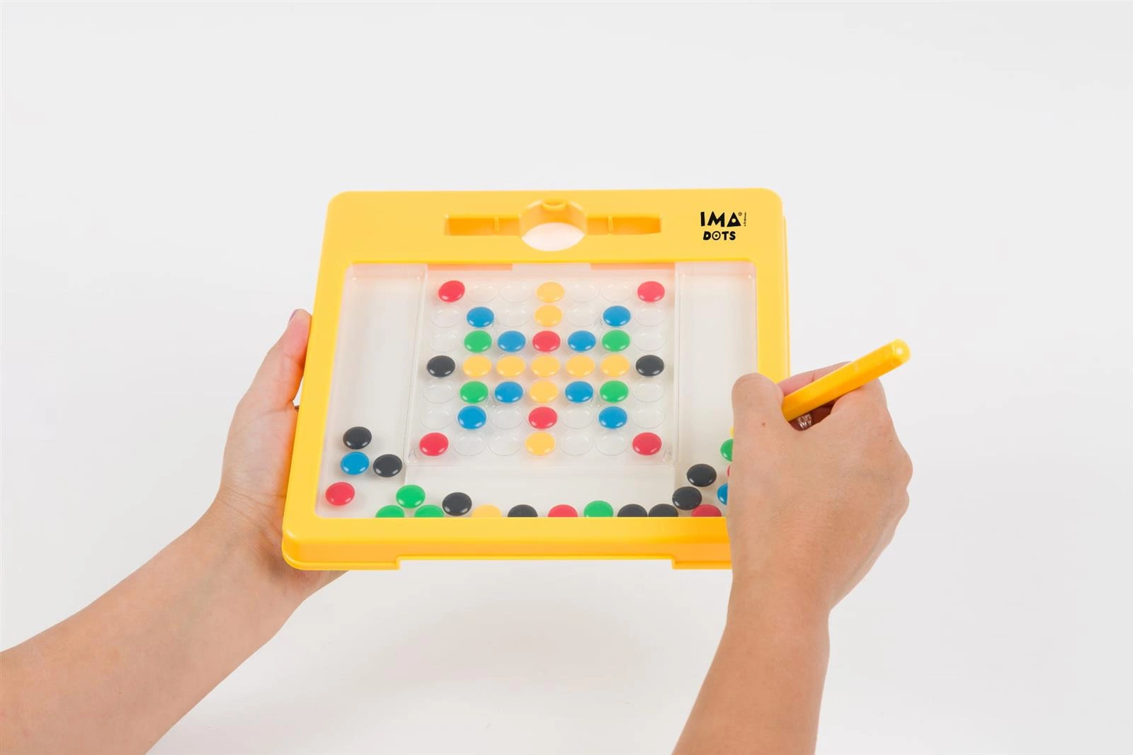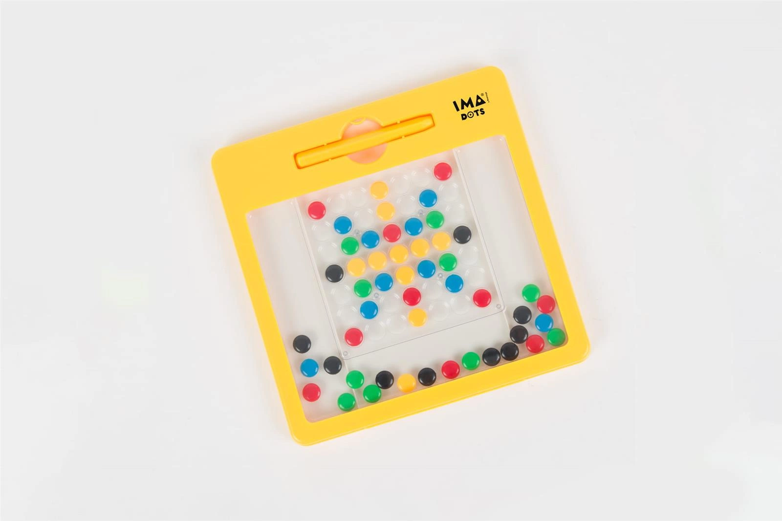 Tablica magnetyczna Imadots MINI to idealny sposób na nudę! Za pomocą dołączonego, magnetycznego rysika dzieci "rysują" obrazki, przesuwając kolorowe żetony na magnes pod plastikową pleksą. Na planszy znajdują się wydrążone miejsca, w które idealnie mieszczą się żetony, zapobiegając ich przesuwaniu się. Zabawka jest w pełni bezpieczna: kolorowe żetony nie mogą wypaść.