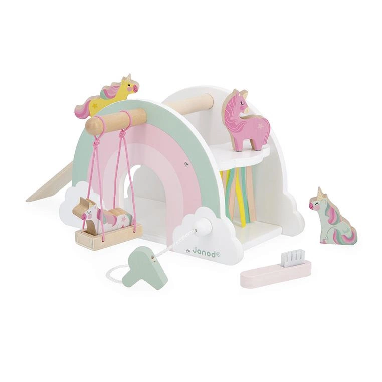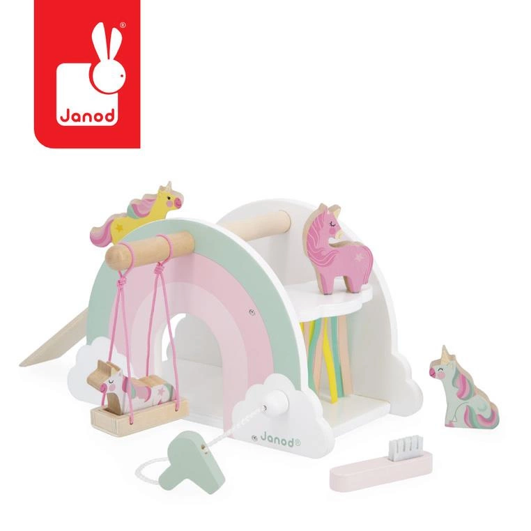 Drewniany domek jednorożców francuskiej marki JANOD to doskonała zabawka dla dziewczynki. W skład zestawu wchodzi piętrowy domek ze ściankami w kształcie tęczy, zjeżdżalnią, myjnią z tasiemek i zewnętrzną huśtawką. Ponadto w komplecie są 4 drewniane figurki jednorożców oraz szczotka i suszarka do ich pielęgnacji. Zestaw pozwala na tworzenie wielu scenariuszy zabaw i zachęca do snucia opowieści. Idealnie nadaje się na prezent.