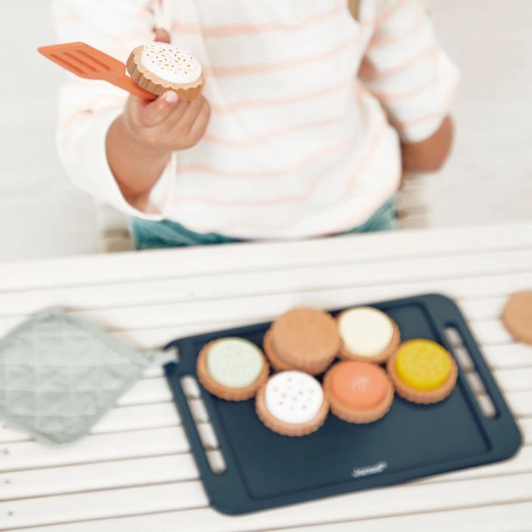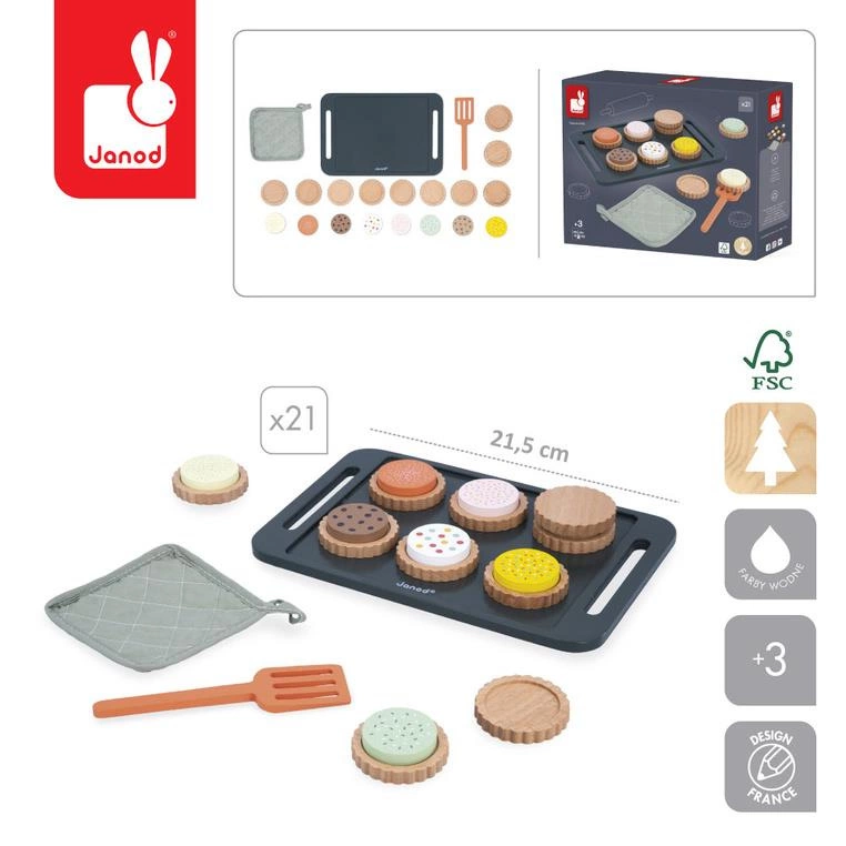 Drewniany zestaw do pieczenia ciasteczek z kolekcji Shiny Grandma francuskiej marki JANOD sprawi mnóstwo radości każdemu dziecku. Sprawdzi się zarówno jako samodzielna zabawka, jak i uzupełnienie każdej dziecięcej kuchni, inspirując do kreatywnej zabawy w gotowanie.