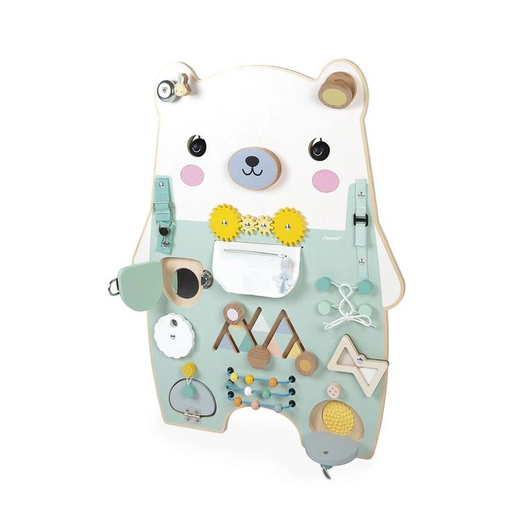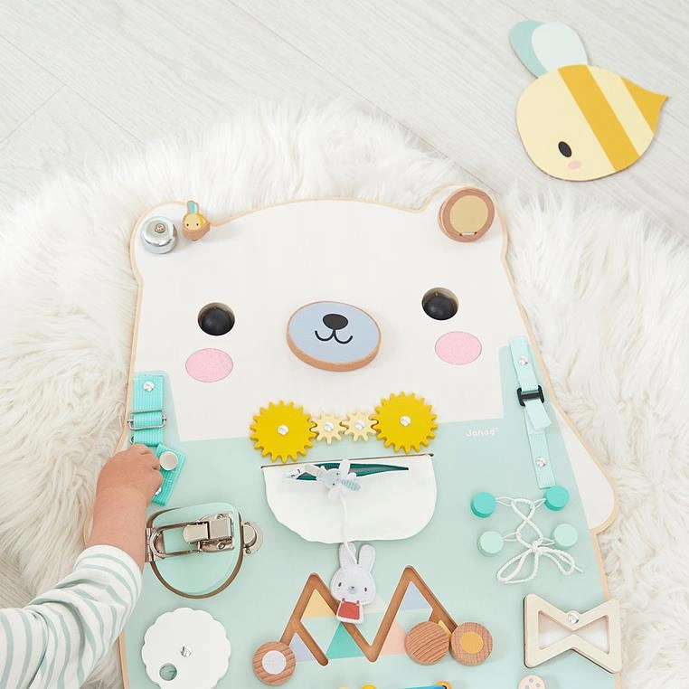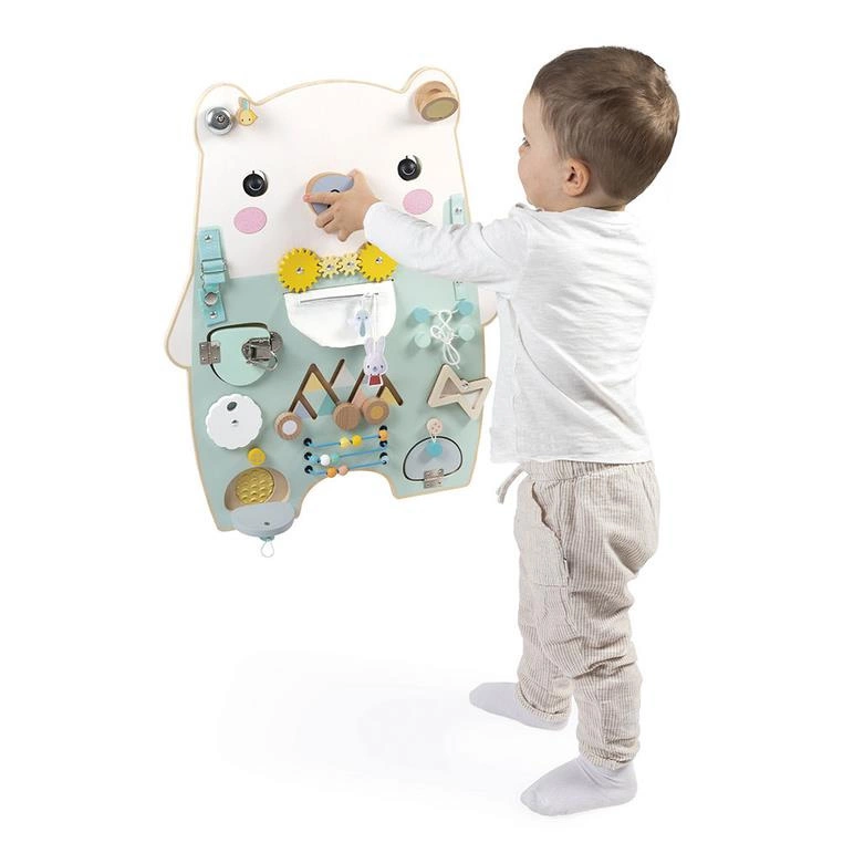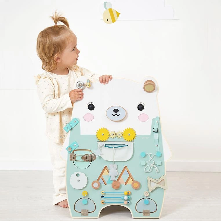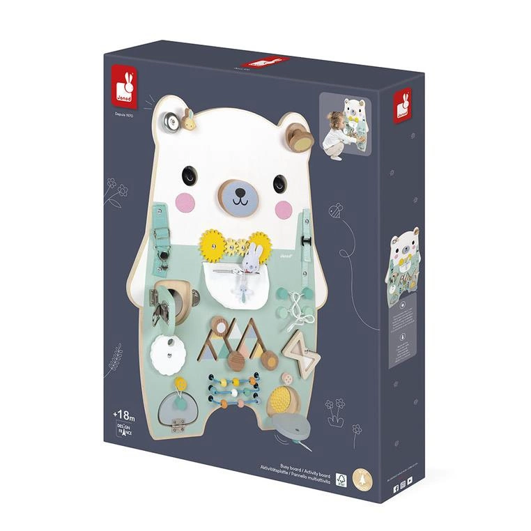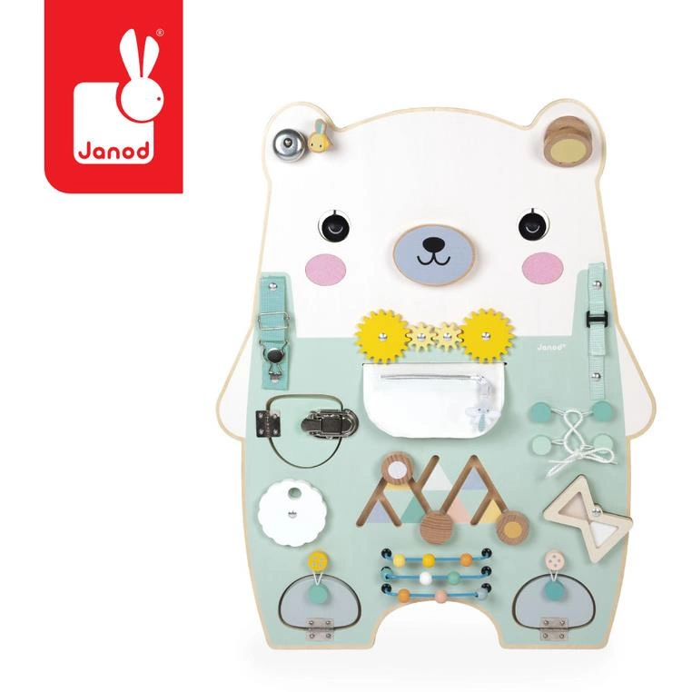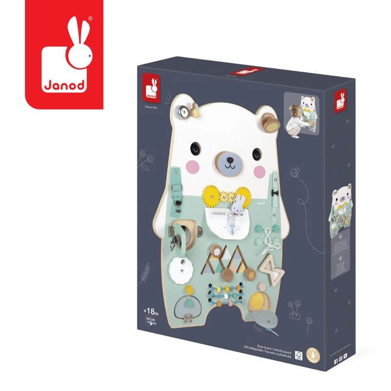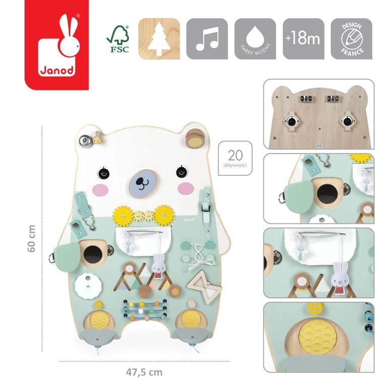 Janod Duża drewniana tablica manipulacyjna 20 aktywności Miś Pure 18m+