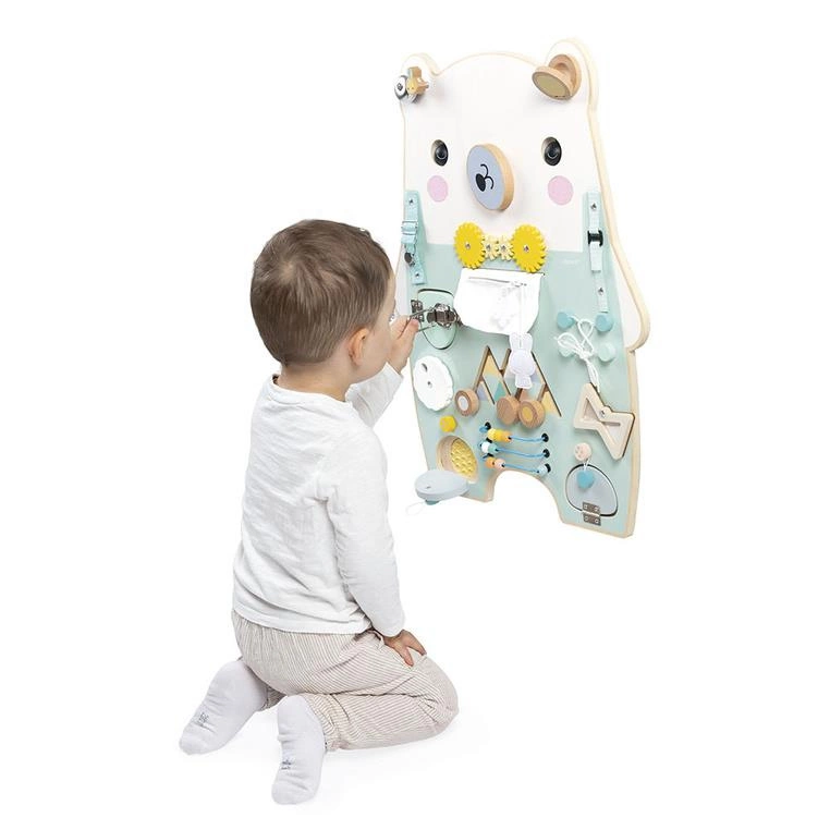 Duża drewniana tablica manipulacyjna Miś z serii Pure francuskiej marki JANOD to idealna zabawka dla dzieci od 18. miesiąca życia. Wymaga solidnego zamontowania do ściany. Zachwyca estetyką wykonania i pięknymi detalami. Oferuje w sumie 20 aktywności, w tym m.in. różnego rodzaju zapięcia, wiązania i elementy do przesuwania czy stymulacji sensorycznej (zróżnicowane fakturowo), kółka zębate czy dzwonek.