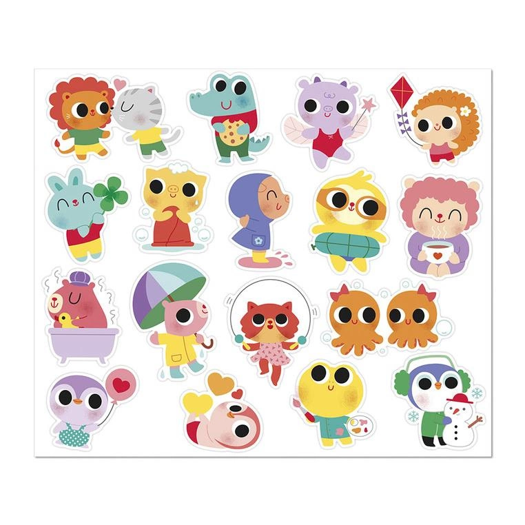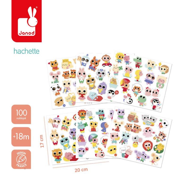 Zestaw naklejek Małe zwierzęta francuskiej marki JANOD zawiera 100 szt. dużych naklejek wielokrotnego użytku, rozmieszczonych na 6 arkuszach (17 x 20 cm każdy). Naklejki są odpowiednie dla dzieci już o 18 miesiąca życia – mają optymalny dla małych rączek rozmiar. Naklejki przedstawiają urocze scenki z życia młodych zwierzaczków, np. kapibarę w kąpieli, kurczaczka na hulajnodze czy jeżyka puszczającego latawiec. Połowa z nich posiada połyskującą, metaliczną powierzchnię, co dodaje im wyjątkowego uroku.