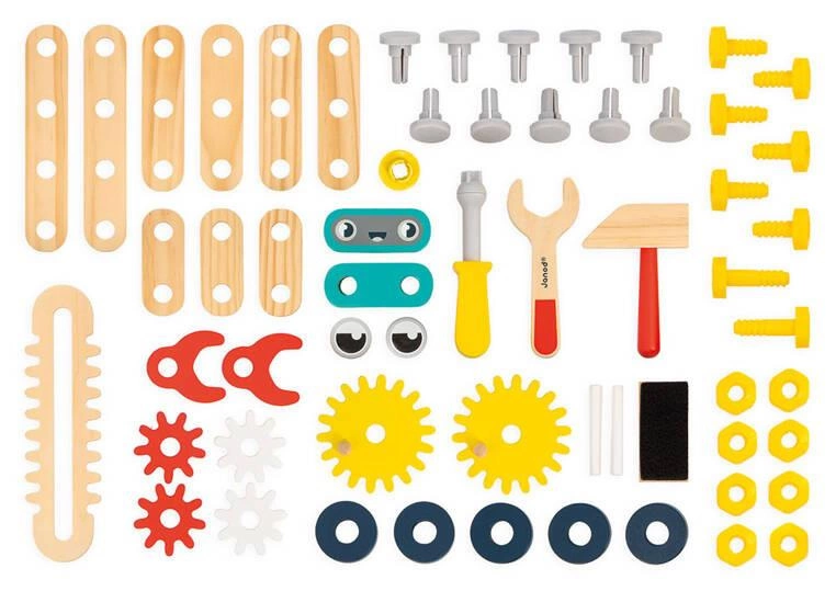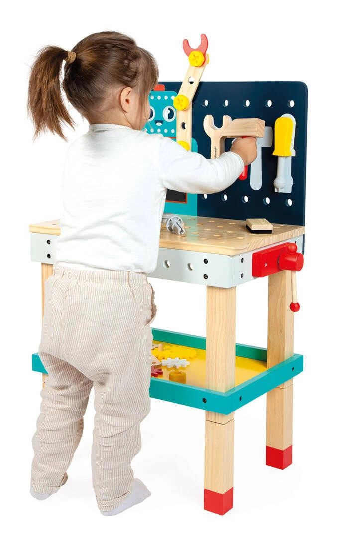 Drewniany, w pełni wyposażony stolik warsztatowy z narzędziami Robot z serii Brico'Kids francuskiej marki JANOD to idealny prezent dla małego majsterkowicza. Zestaw składa się z 60 elementów: stołu na 4 stabilnych nogach ze ścianką, ozdobioną wizerunkiem robota i mini-tablicą na projekty lub notatki, wraz z kompletem śrubek, nakrętek, podkładek oraz kół zębatych, młotka, klucza i śrubokręta. Narzędzia są magnetyczne i przyczepiają się do ścianki warsztatu. Ponadto jest on wyposażony w blat roboczy, boczne imadło oraz dolną półkę do przechowywania. Może się nim bawić jednocześnie więcej niż jedno dziecko.