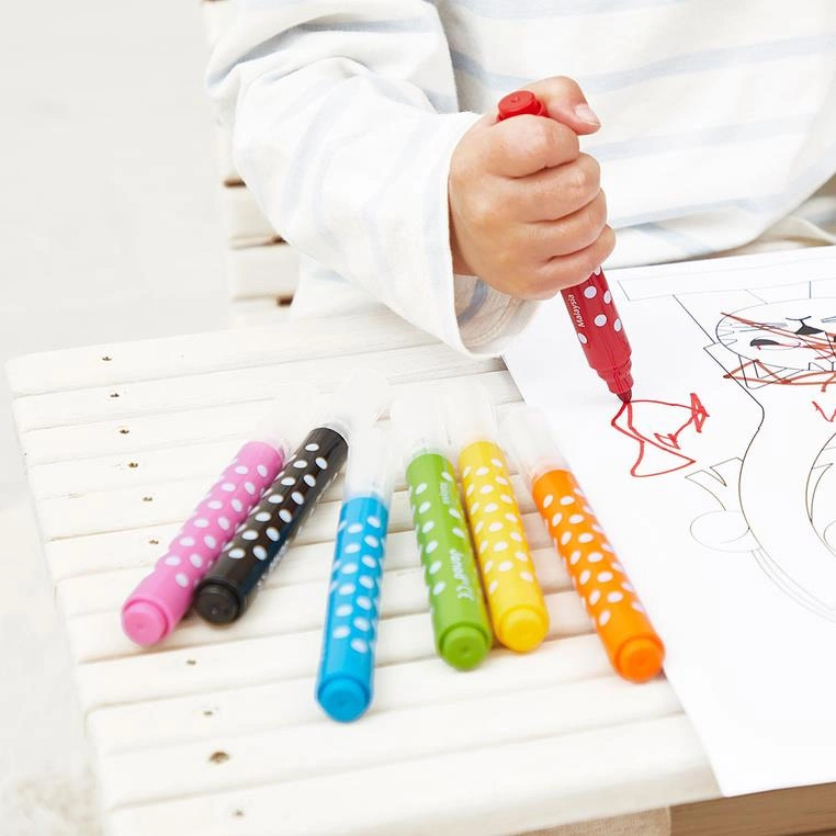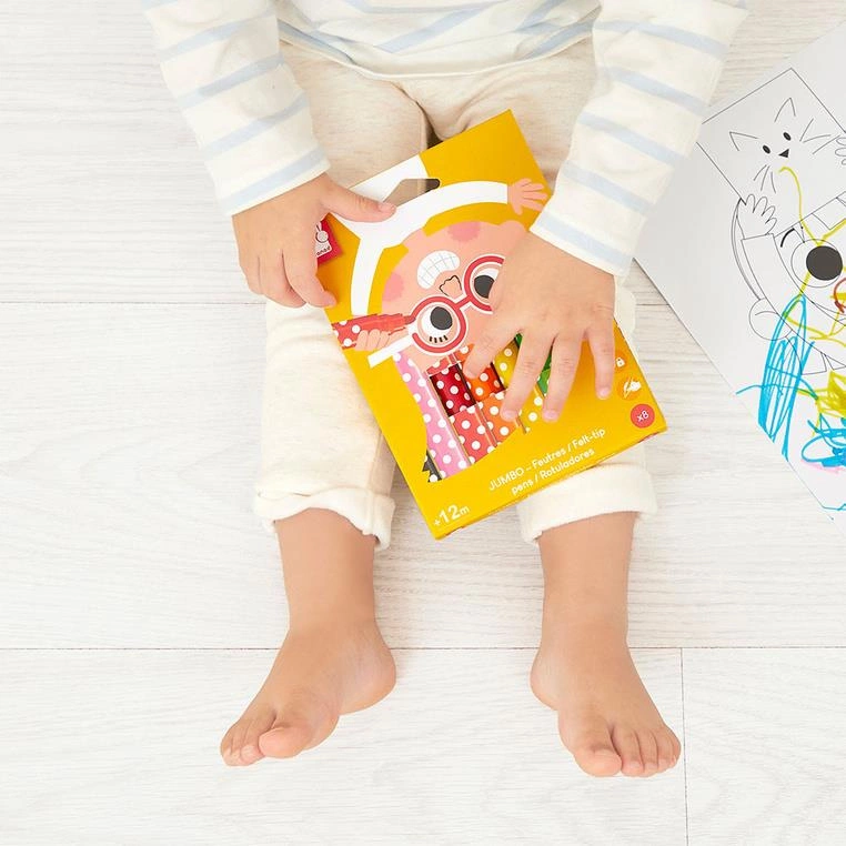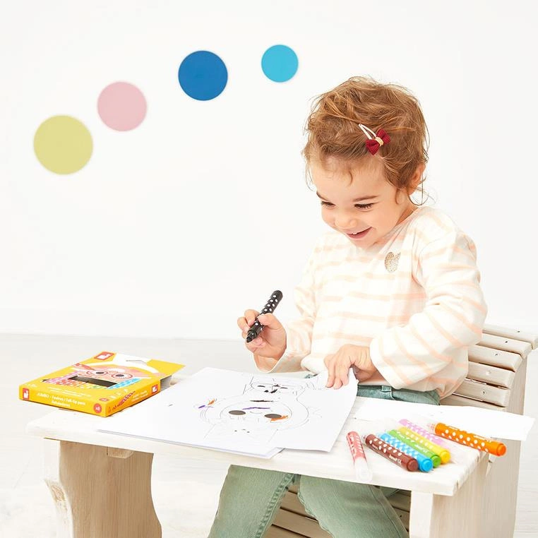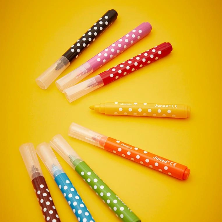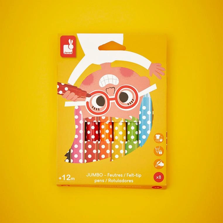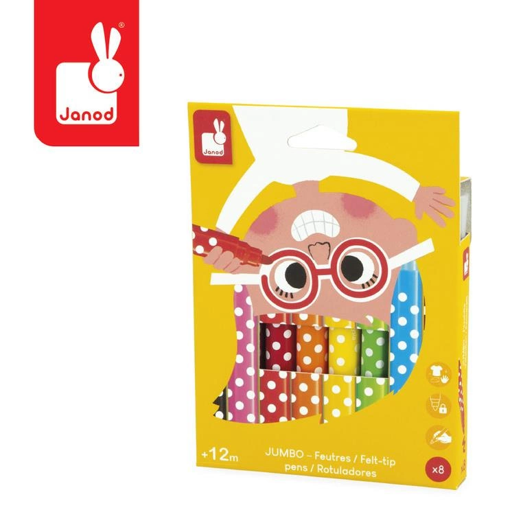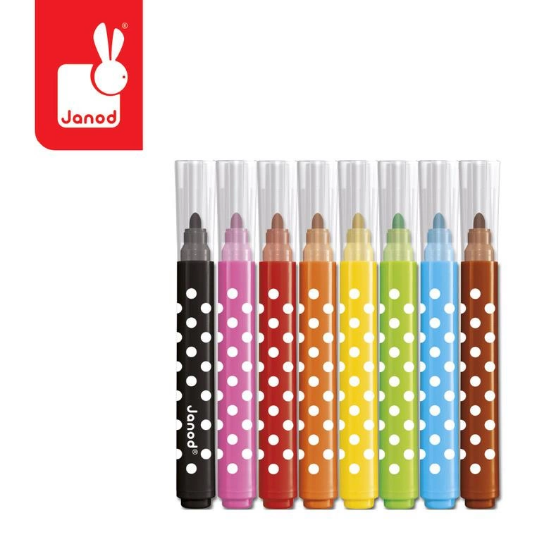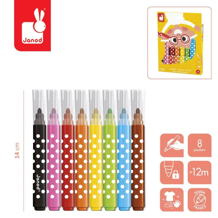 Zestaw 8 flamastrów francuskiej marki JANOD w pięknych, intensywnych kolorach. Są grube, poręczne, z prostokątnymi uchwytami o miękkich brzegach w białe kropeczki. Mają bezpieczne zatyczki na klik. Są łatwe do zmycia. Zapakowane w estetyczne kartonowe pudełko z dziecięcą grafiką.