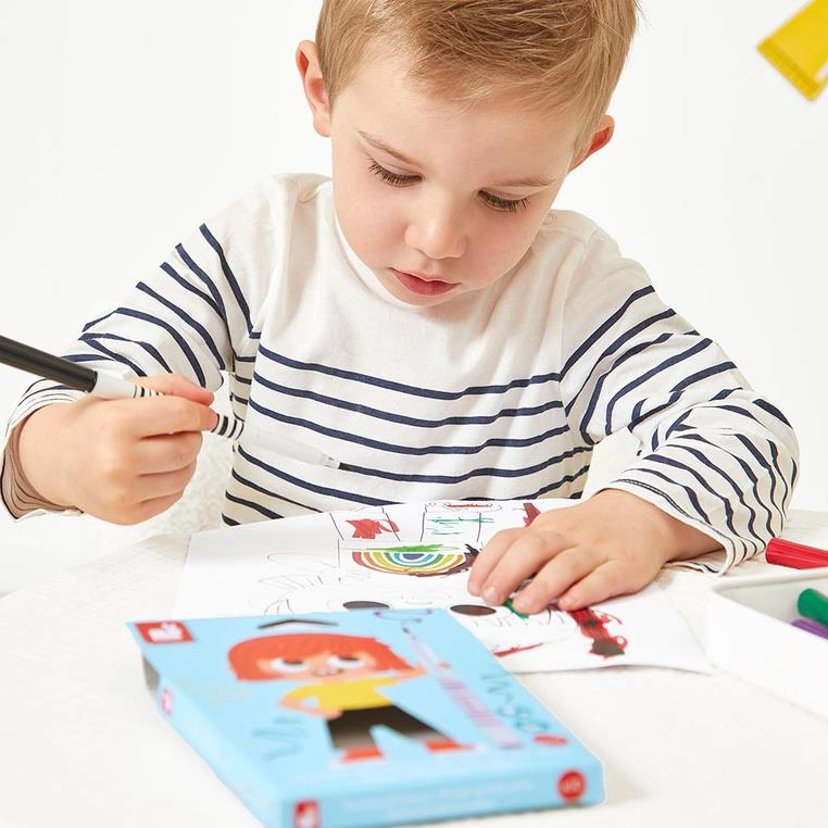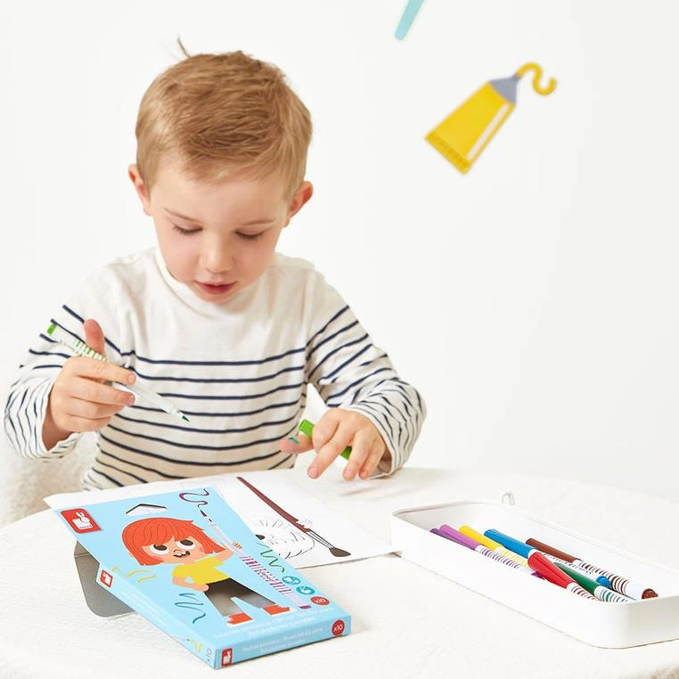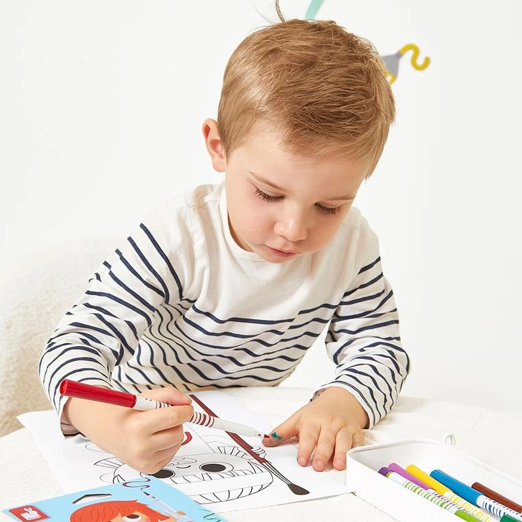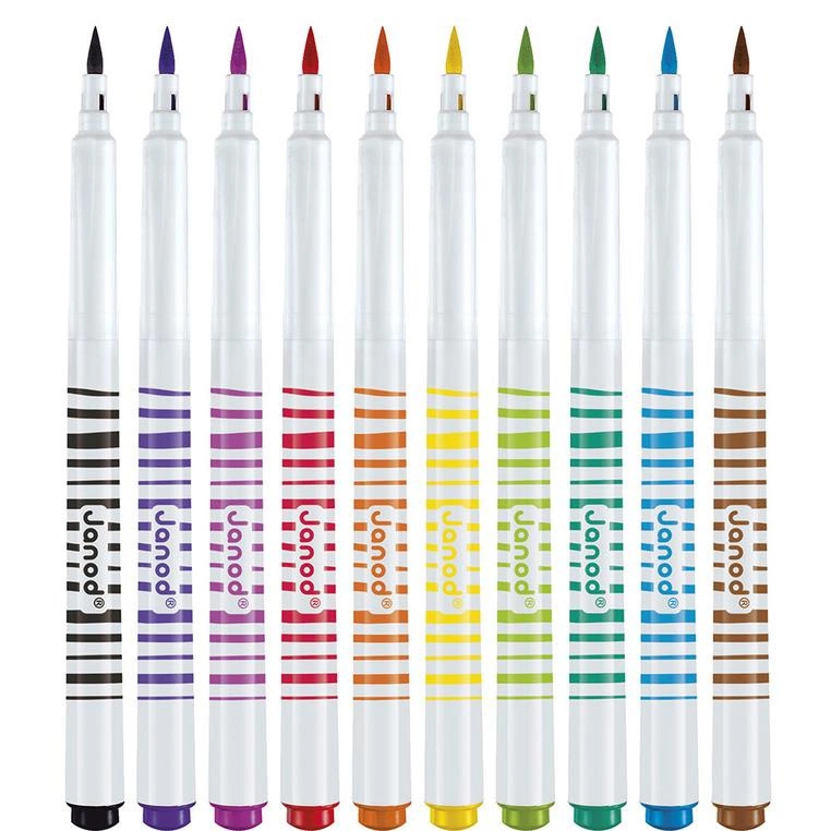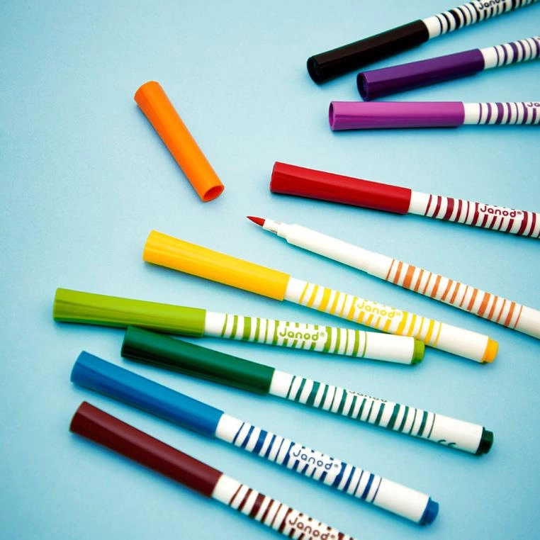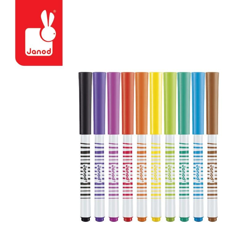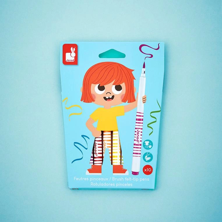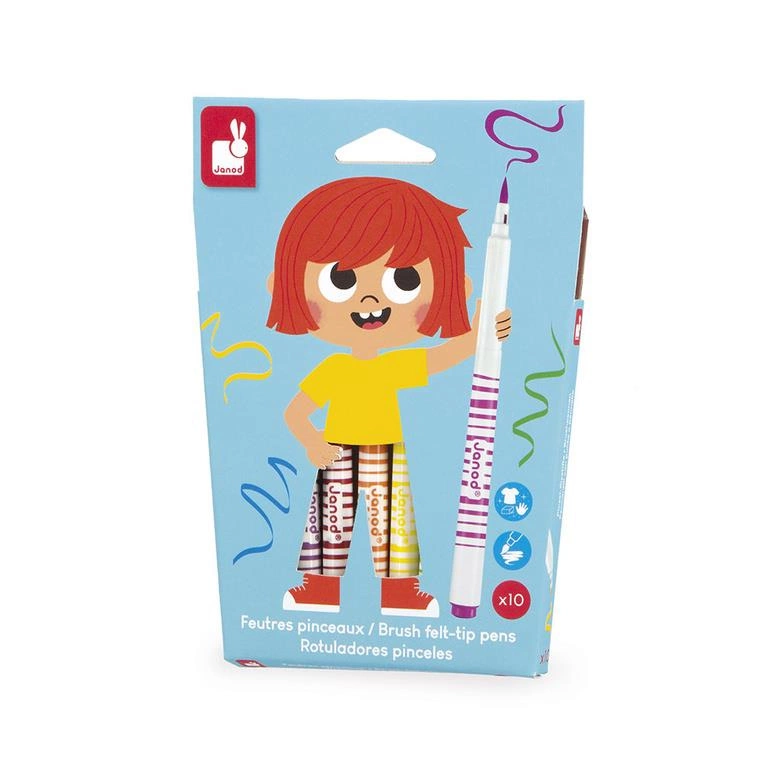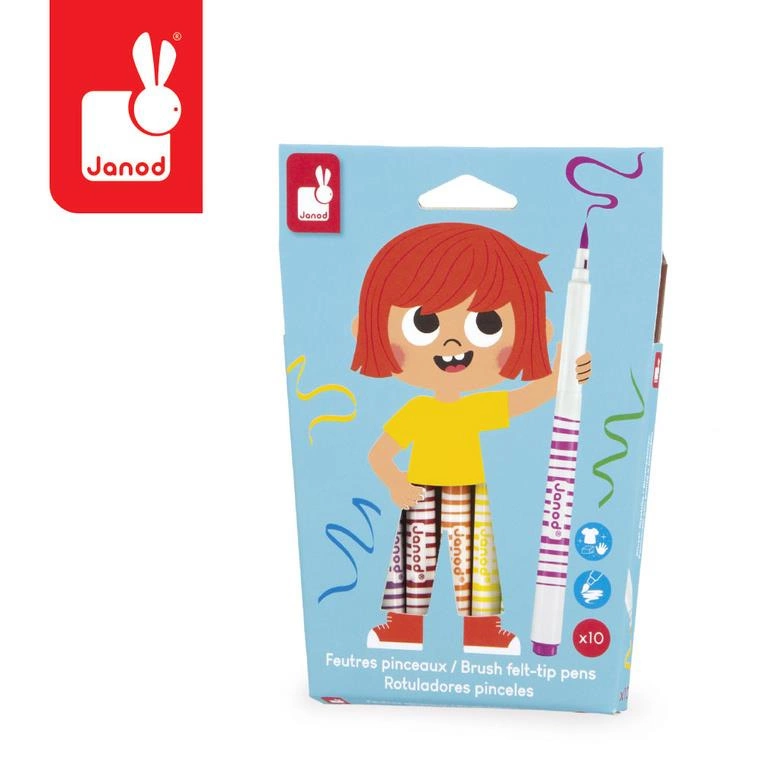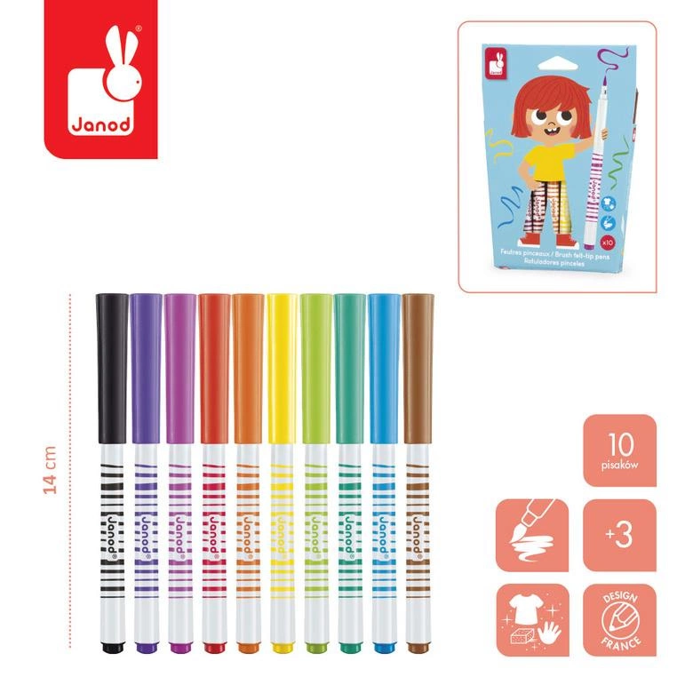 Zestaw 10 flamastrów pędzelkowych francuskiej marki JANOD w pięknych, intensywnych kolorach. Są poręczne, z okrągłymi uchwytami. Mają mięciutką filcową końcówkę, przypominającą pędzelek i długie zatyczki. Zapakowane w estetyczne kartonowe pudełko z dziecięcą grafiką.