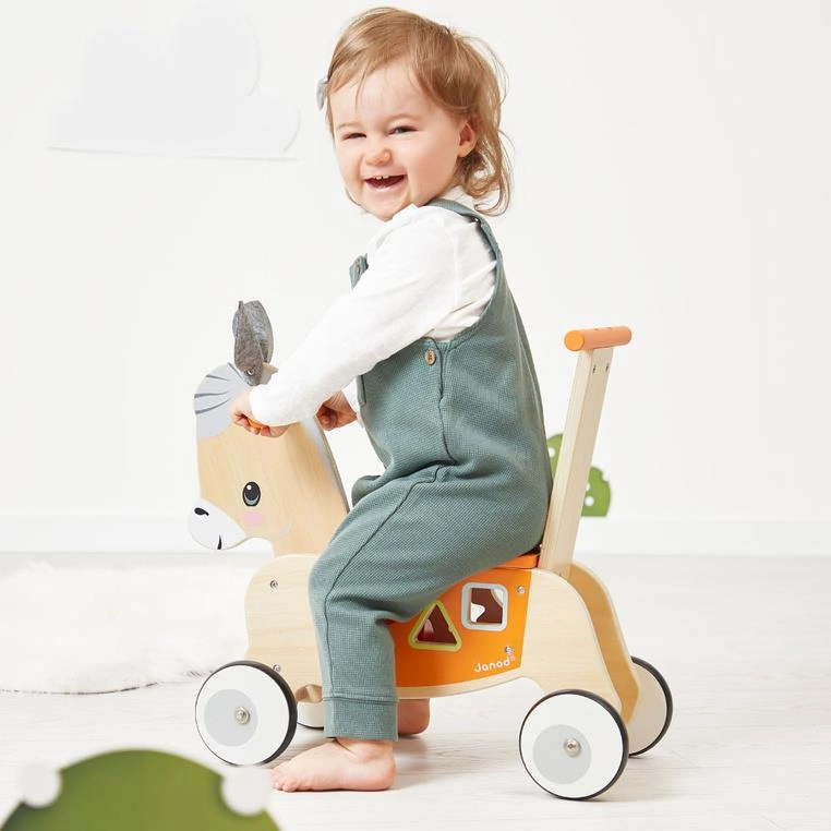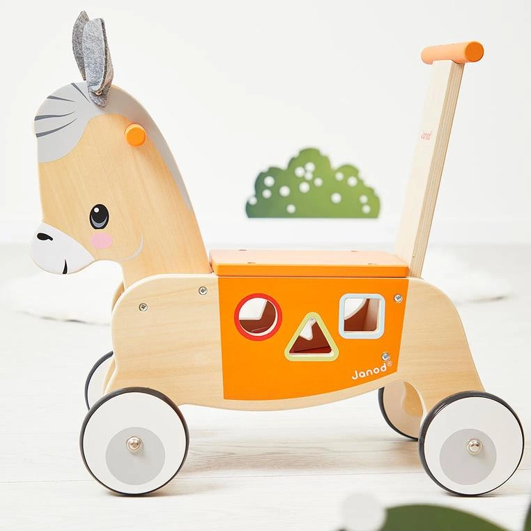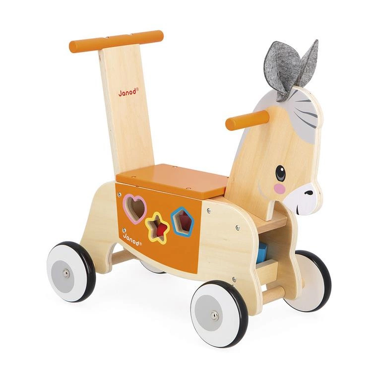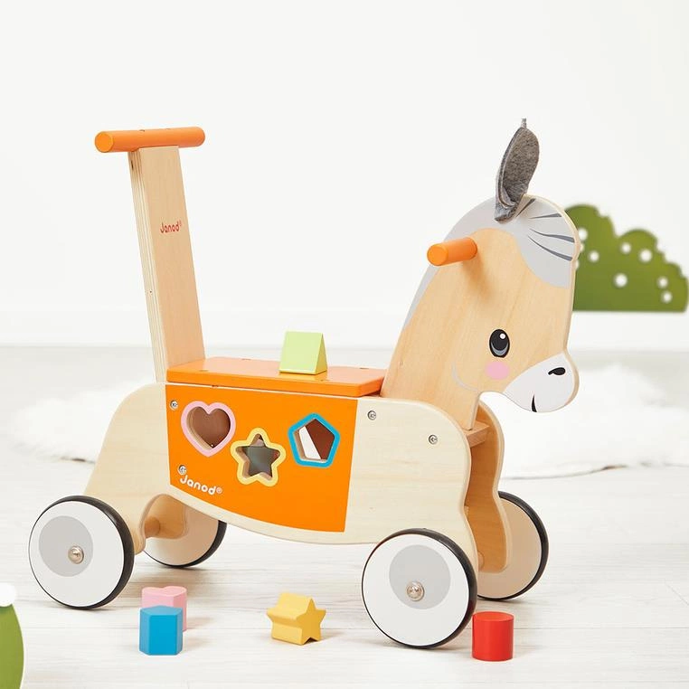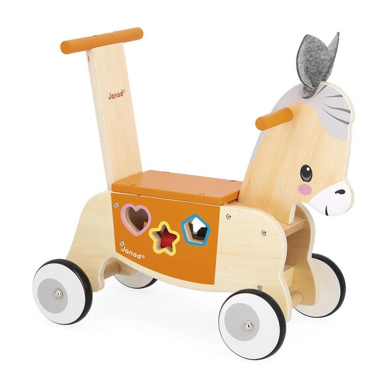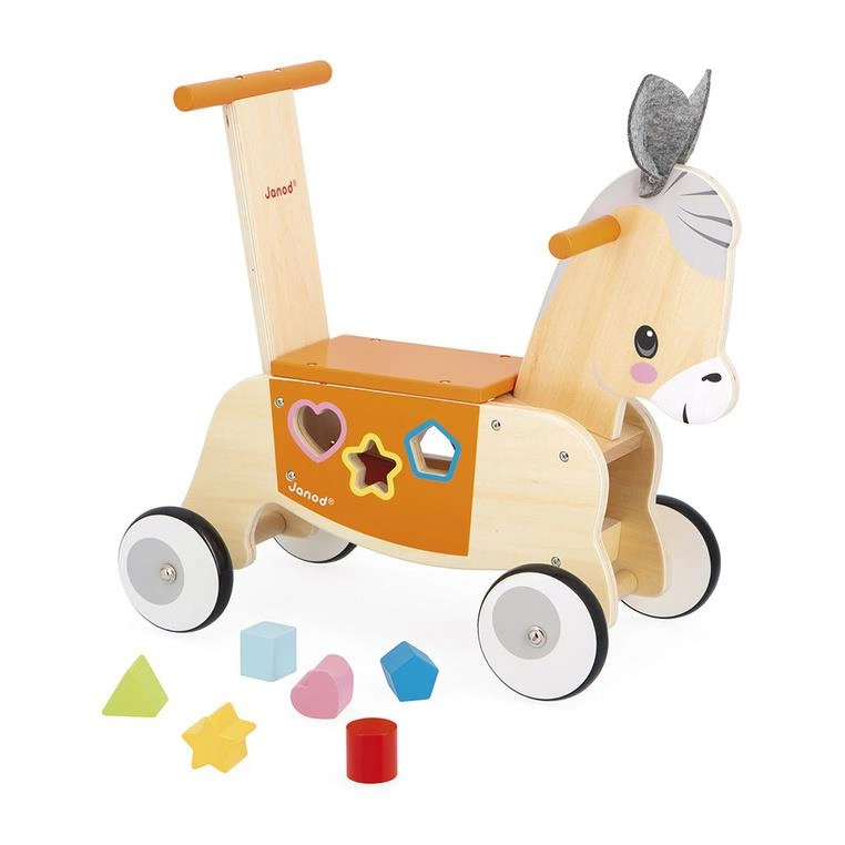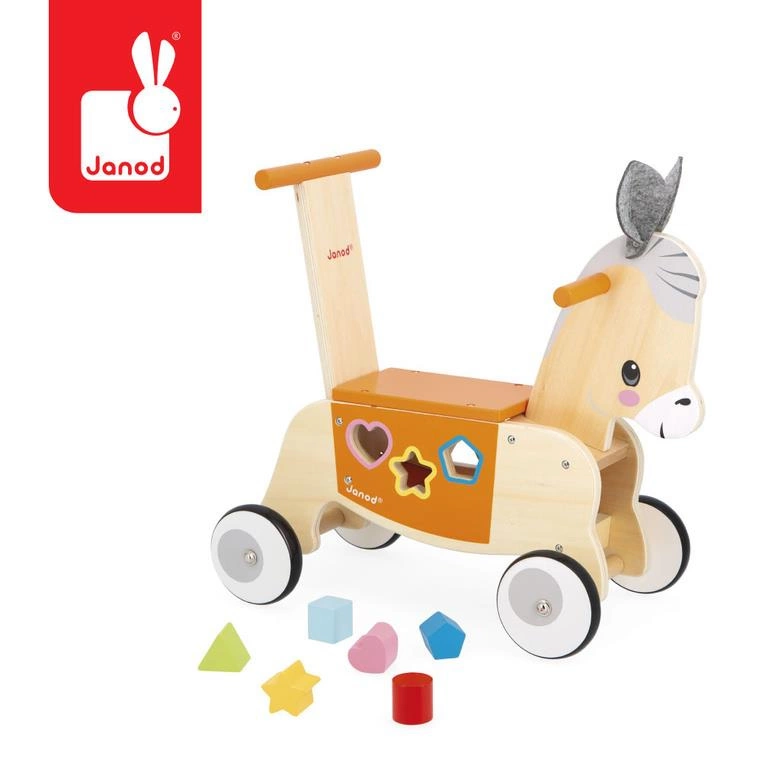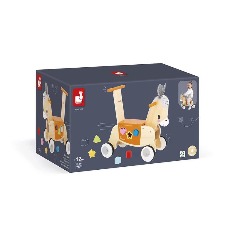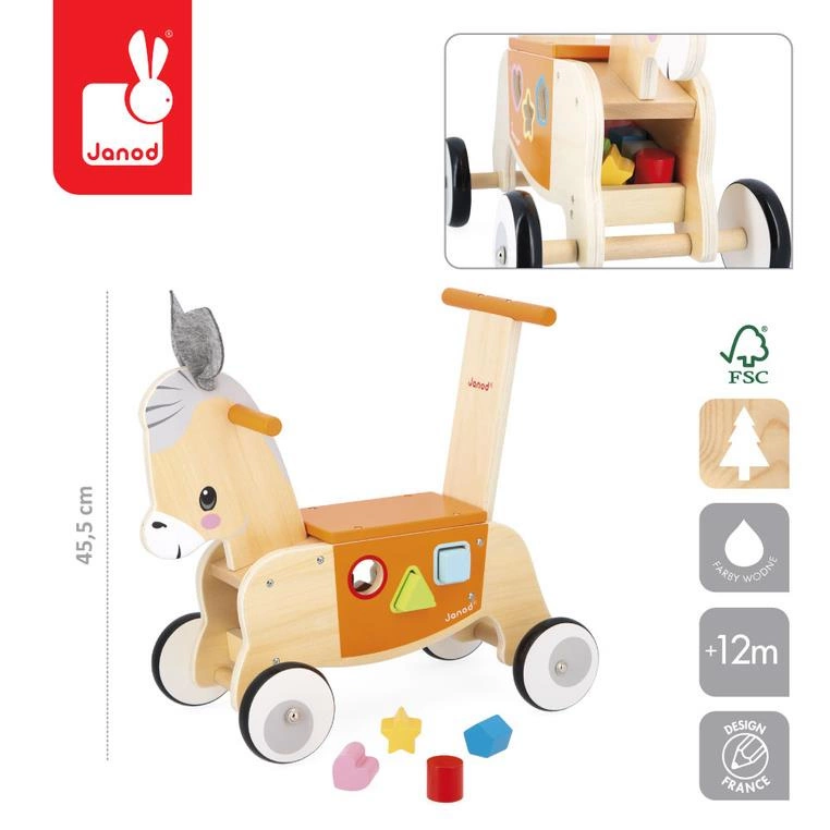 Janod Jeździk i pchacz 2w1 z sorterem kształtów Osiołek Farma 12m+